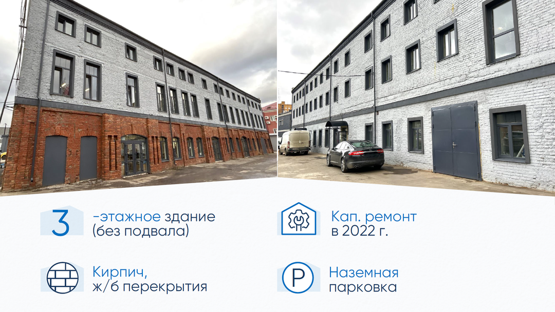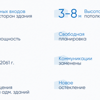 Высота потолков от 3 до 8 м. Общий ЗУ на несколько строений в аренде до 2061 г. Выделенная на строение мощность составляет 149 кВт.