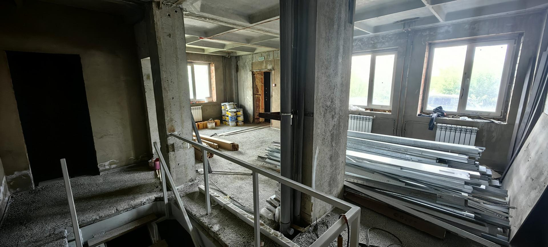 Полы выровнены с помощью технологии наливного пола. Перегородка СУ выполнена. Установлены батареи отопления, пожарная сигнализация, металлическая лестница в цоколь. Снаружи здания обустроено металлическое крыльцо с навесом, а также дорожка для инвалидных колясок. Новая входная дверь с теплоизоляцией.
