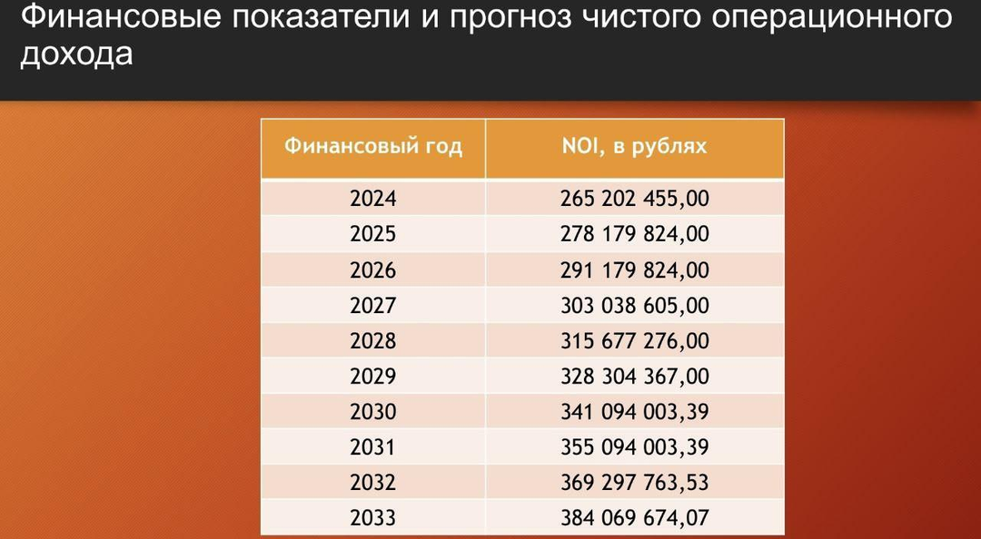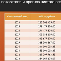Финансовые показатели и прогноз чистого дохода: 2024 г. - 265 202 455 руб., 2025 г. - 278 179 824 руб., 2026 г. - 291 179 824руб., 2027 г. - 303 038 605руб., 2028 г. - 315 677 276 руб., 2029 г. - 328 304 367 руб., 2030 г. - 341 094 004, 2031 г. - 355 094 004 руб., 2032 г. - 369 297 764 руб., 2033 г. - 384 069 675 руб.