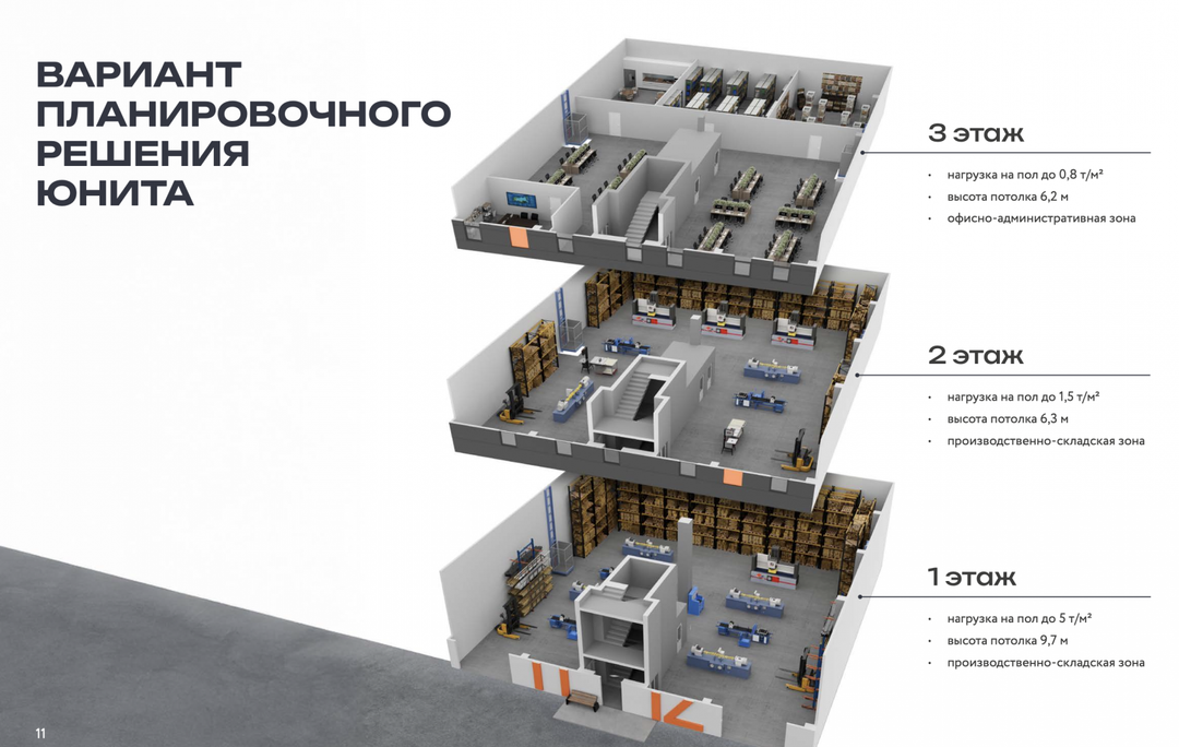 Характеристики помещения:Этажность: трёхэтажный блок (собственная лестница внутри).Высота потолков: 1 этаж — 9,7 м, 2 этаж — 6,25 м, 3 этаж — 6,2 м.Нагрузка на пол: 1 эт. — 5 т/м², 2 эт. — 1,5 т/м², 3 эт. — 0,8 т/м².Шаг колонн: 12×12 м — свободная планировка без внутренних перегородок.Энергообеспечение: 50 Вт/м², вводной щит в каждом юните.Коммуникации: центральное водоснабжение, канализация (хозбытовая и ливневая), воздушное отопление, приточно‑вытяжная вентиляция, АПС.Ворота: размер 4×4,35 м.Окна: пластиковые, однокамерные, 2,4×1,2 м.Отделка: без отделки (черновая), свободная планировка.