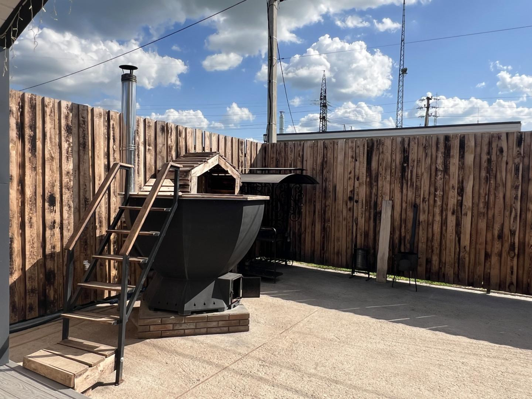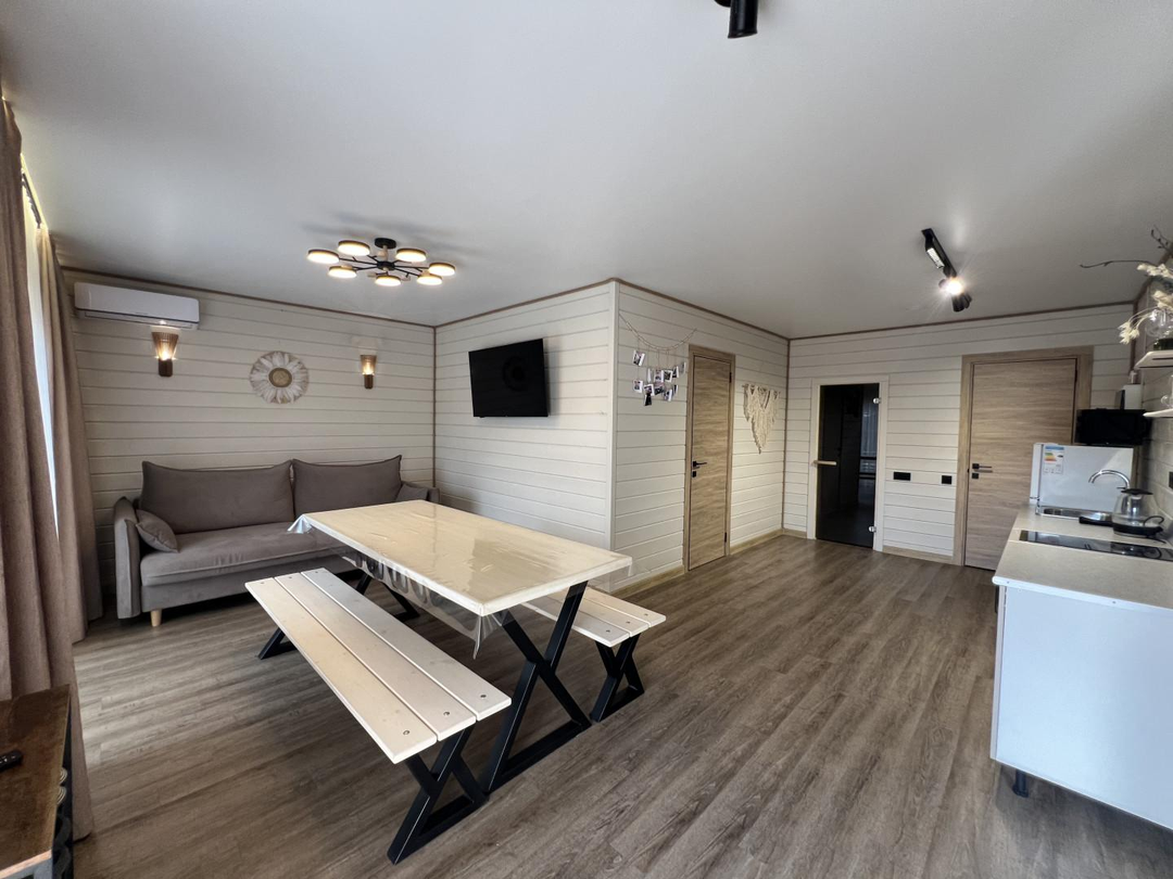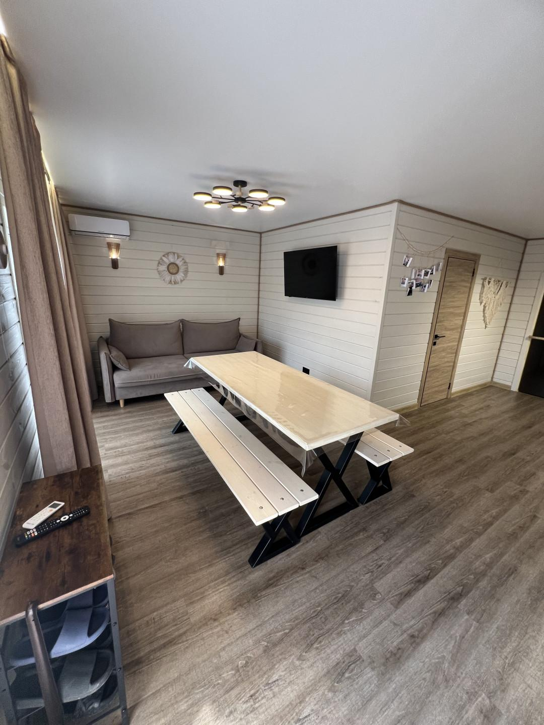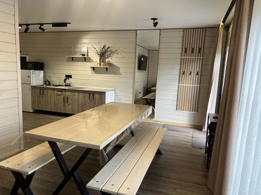 Дом ~54м2, баня на дровах, чан с топкой, мангальная зона, качели, посадочные места на террасе, плюс административный домик сразу за территорией комплекса. Адм.дом: ~16м2. Вода -своя скважина.