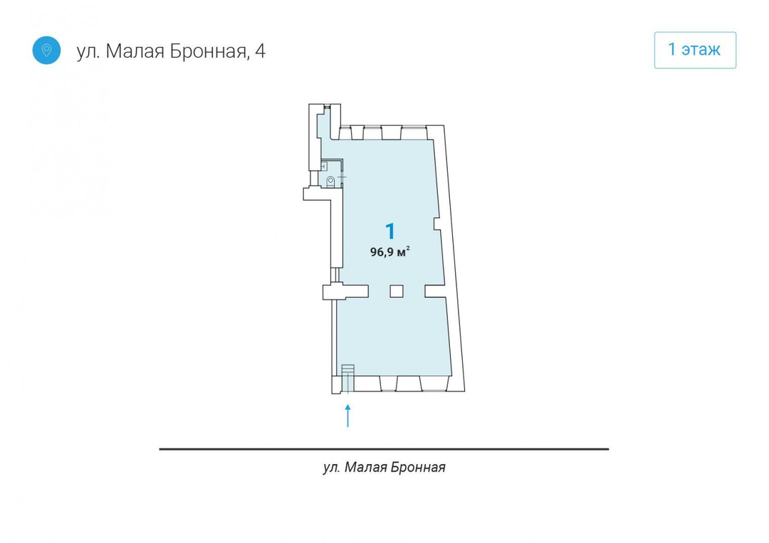 1 этаж жилого дома, формат street retail. Отдельный вход с фасада, хорошая видимость с улицы. Плотный пешеходный трафик в сформированном ресторанно-ритейловом кластере.