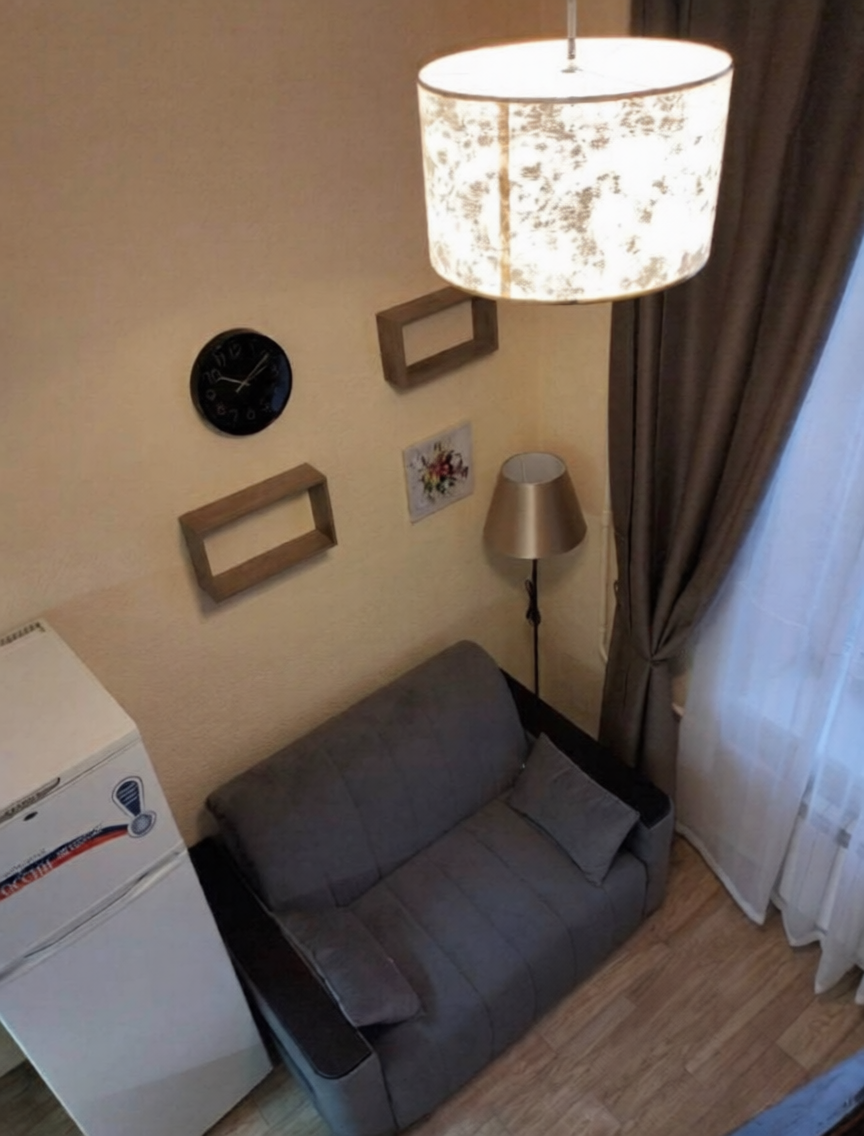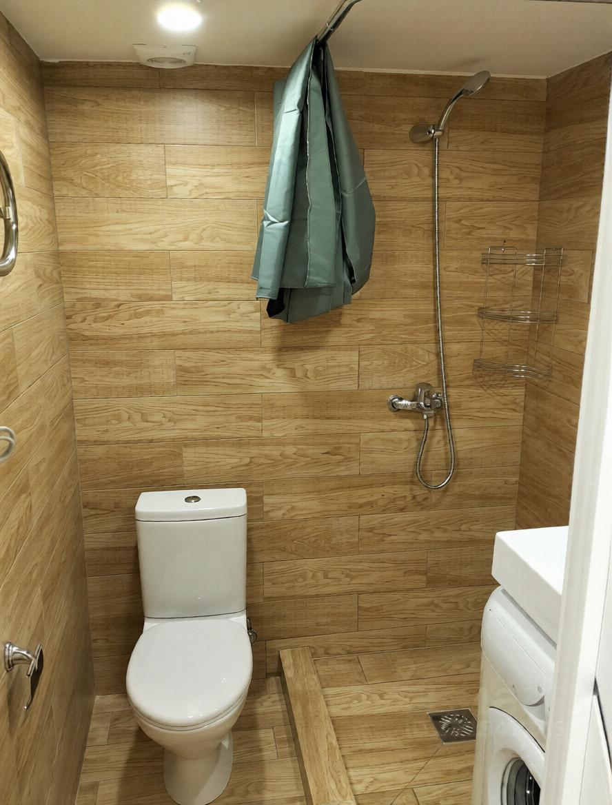 Санузел совмещен, просторный. В санузле имеется стиральная машина, навесной шкаф с зеркалом, душ. В зале остается мебель: раскладной диван, телевизор, портьеры, Кухня остается: Кухонный гарнитур, варочная панель, микроволновка, холодильник, стол, стулья.