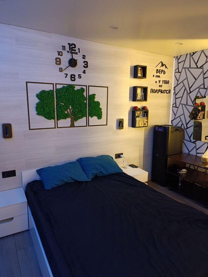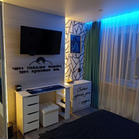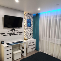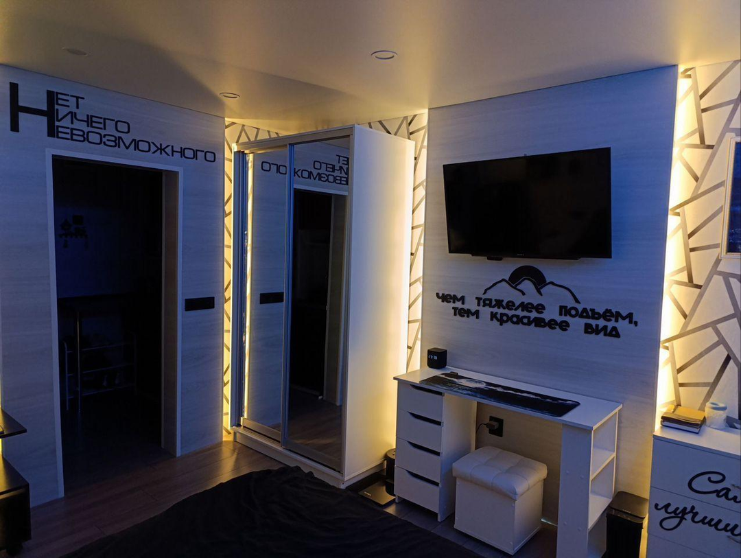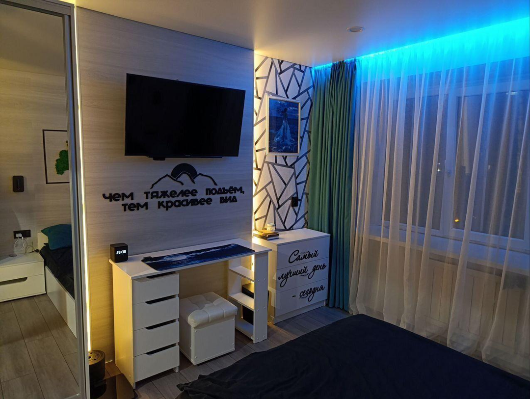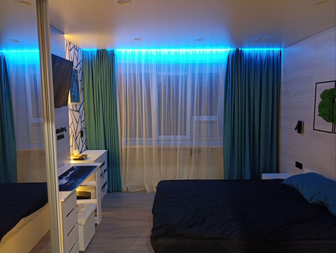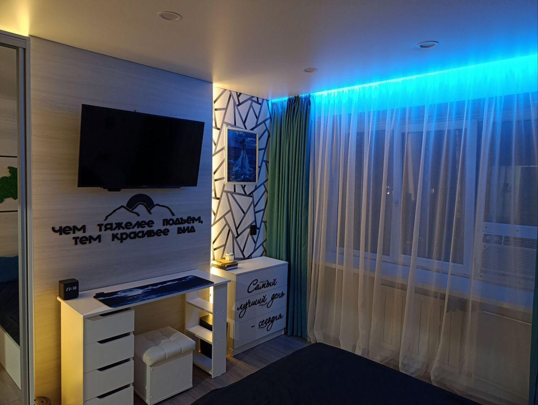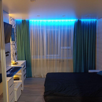 В комнате установлены проходные выключатели на основной свет и подсветку зоны ТВ, что в свою очередь позволяет включать и выключать свет при входе в комнату, а также лежа на кровати. Дополнительно установлена скрытая подсветка в карнизе,которую можно регулировать по цветам и яркости с помощью пульта. В дополнение установлена скрытая подсветка в проходе с кухни в комнату. В комнате установлено 7 розеток.