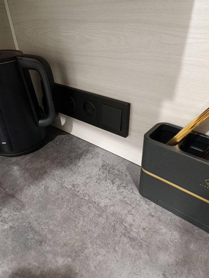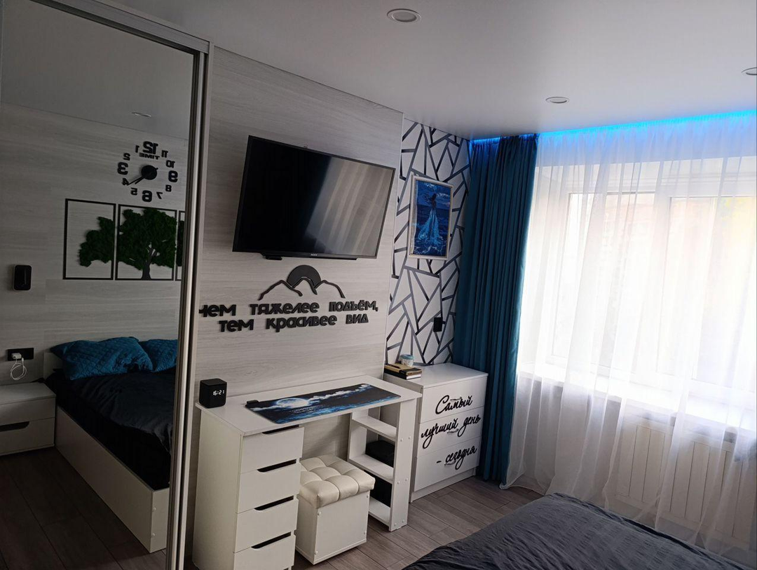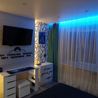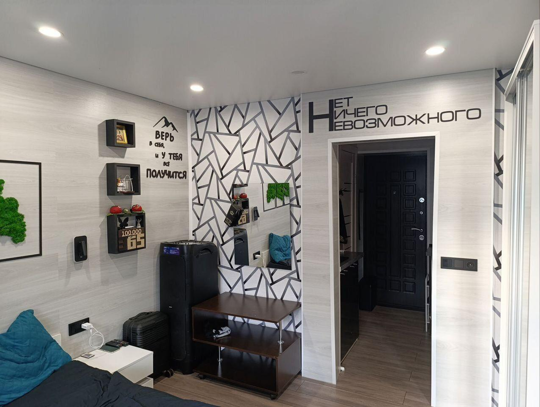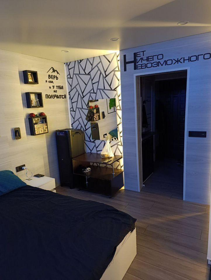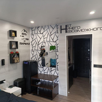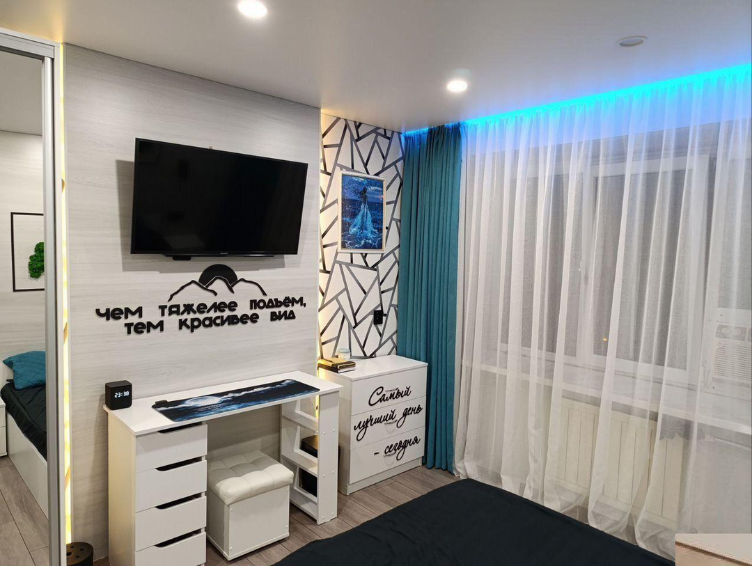 В комнате установлены проходные выключатели на основной свет и подсветку зоны ТВ, что в свою очередь позволяет включать и выключать свет при входе в комнату, а также лежа на кровати. Дополнительно установлена скрытая подсветка в карнизе,которую можно регулировать по цветам и яркости с помощью пульта. В дополнение установлена скрытая подсветка в проходе с кухни в комнату. В комнате установлено 7 розеток.