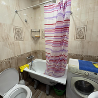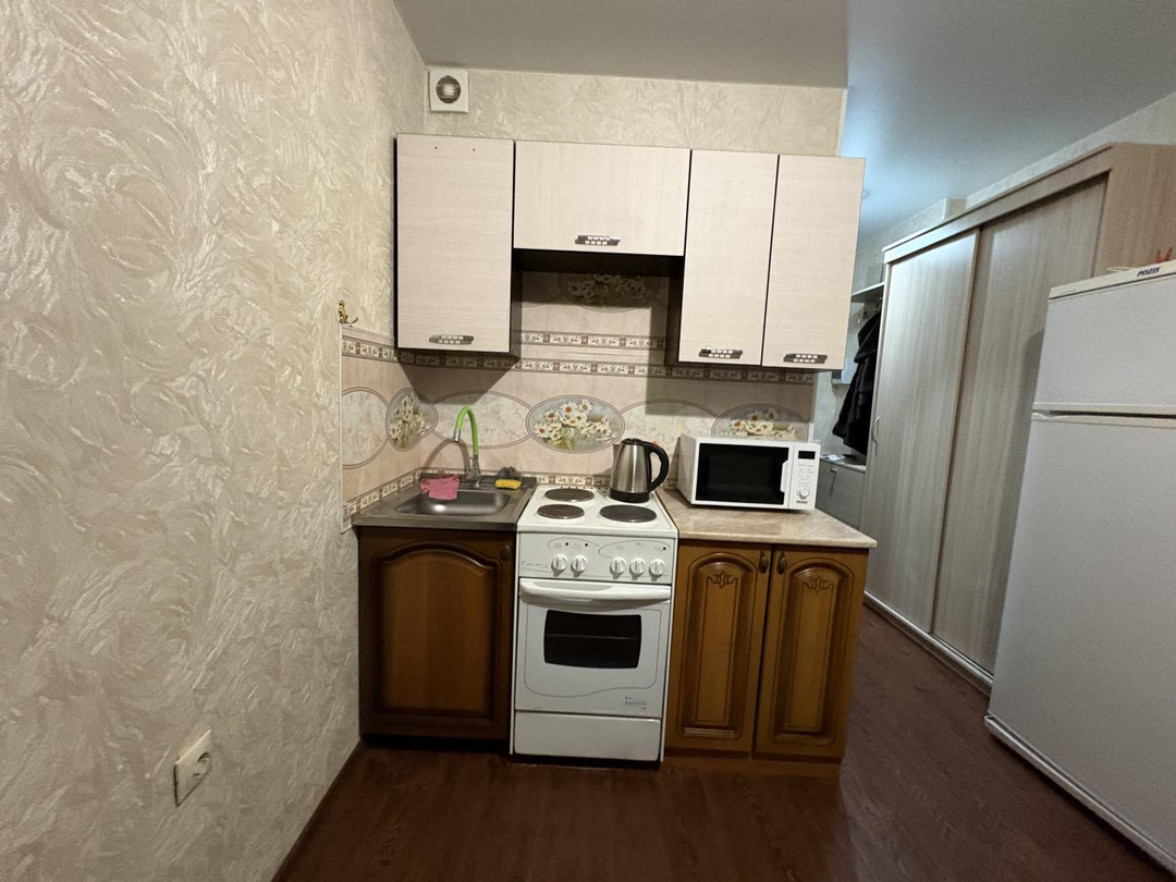 Студия полностью меблирована: кухня оборудована плитой для комфортного приготовления пищи, холодильник, установлен кухонный гарнитур. В зоне отдыха находится диван, который отлично подходит как для релаксации, так и для встреч с друзьями. Санузел полностью обустроен, есть стиральная машина, ванна, зеркало.