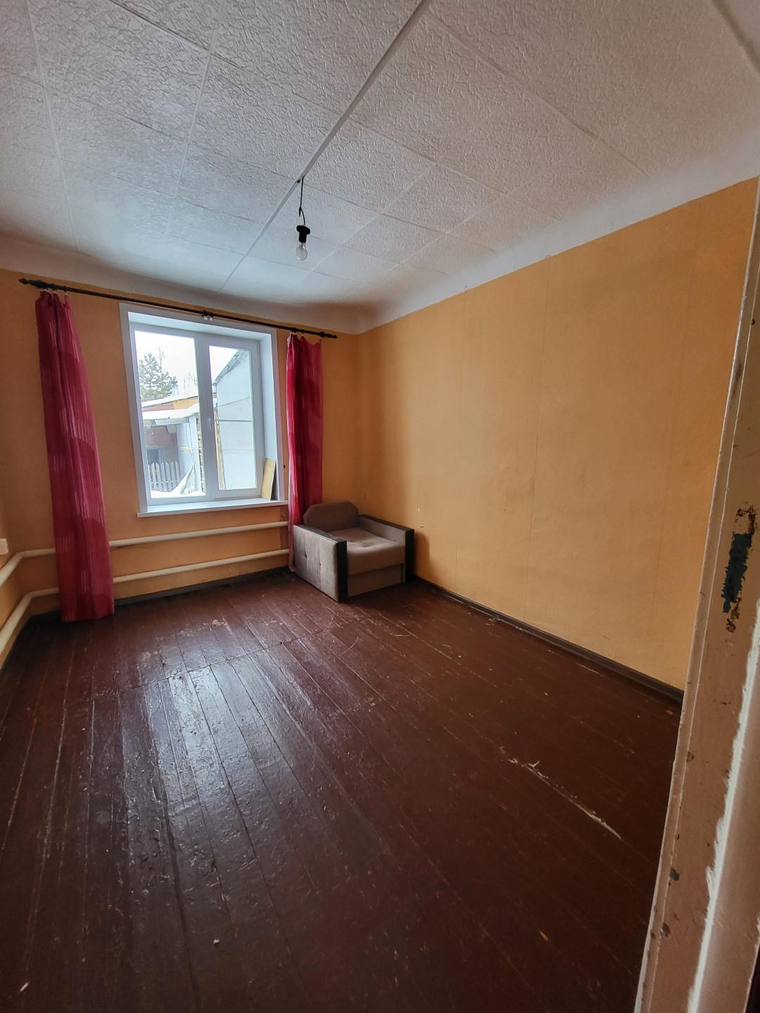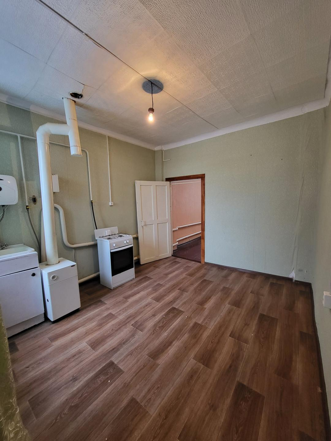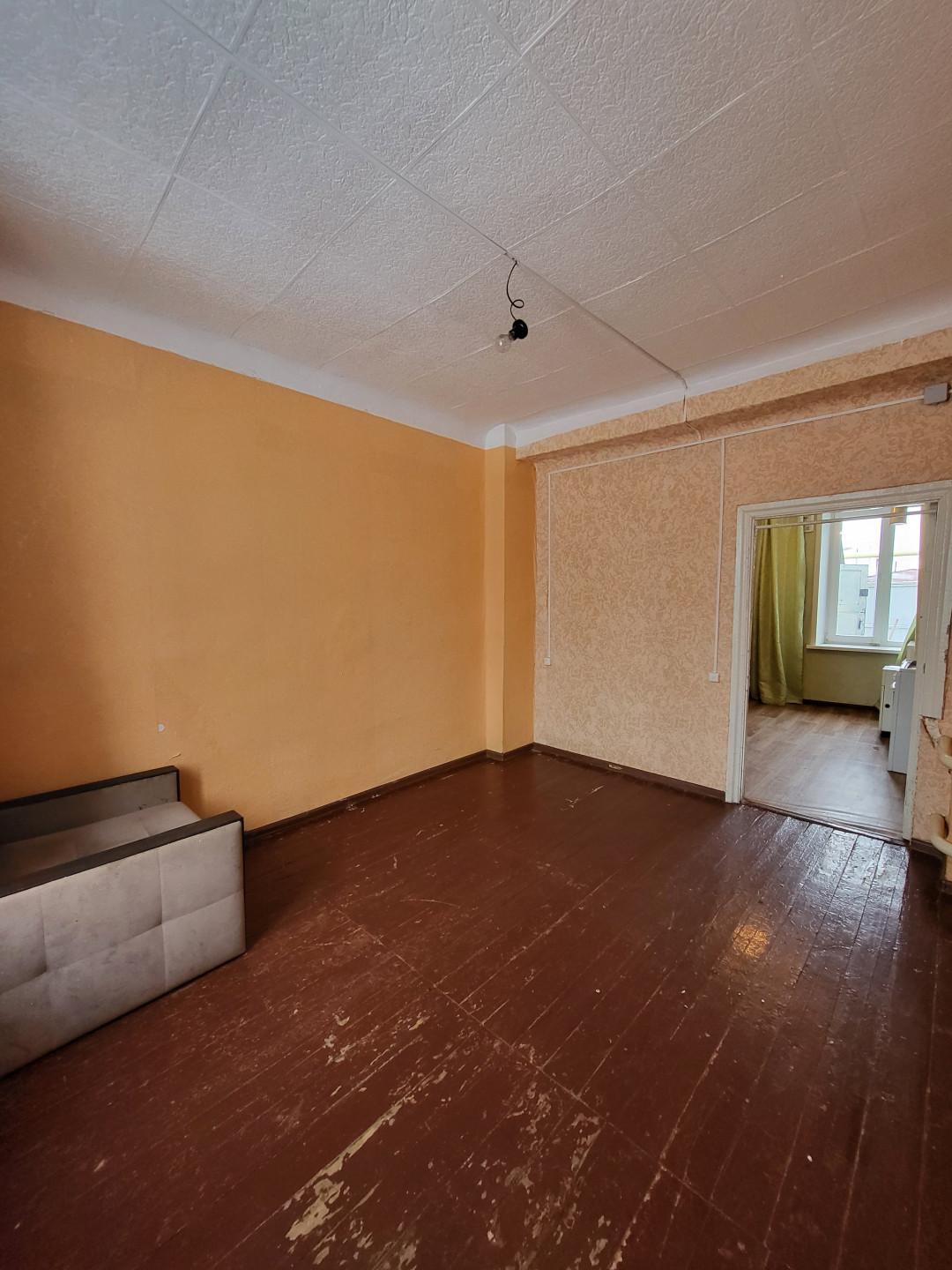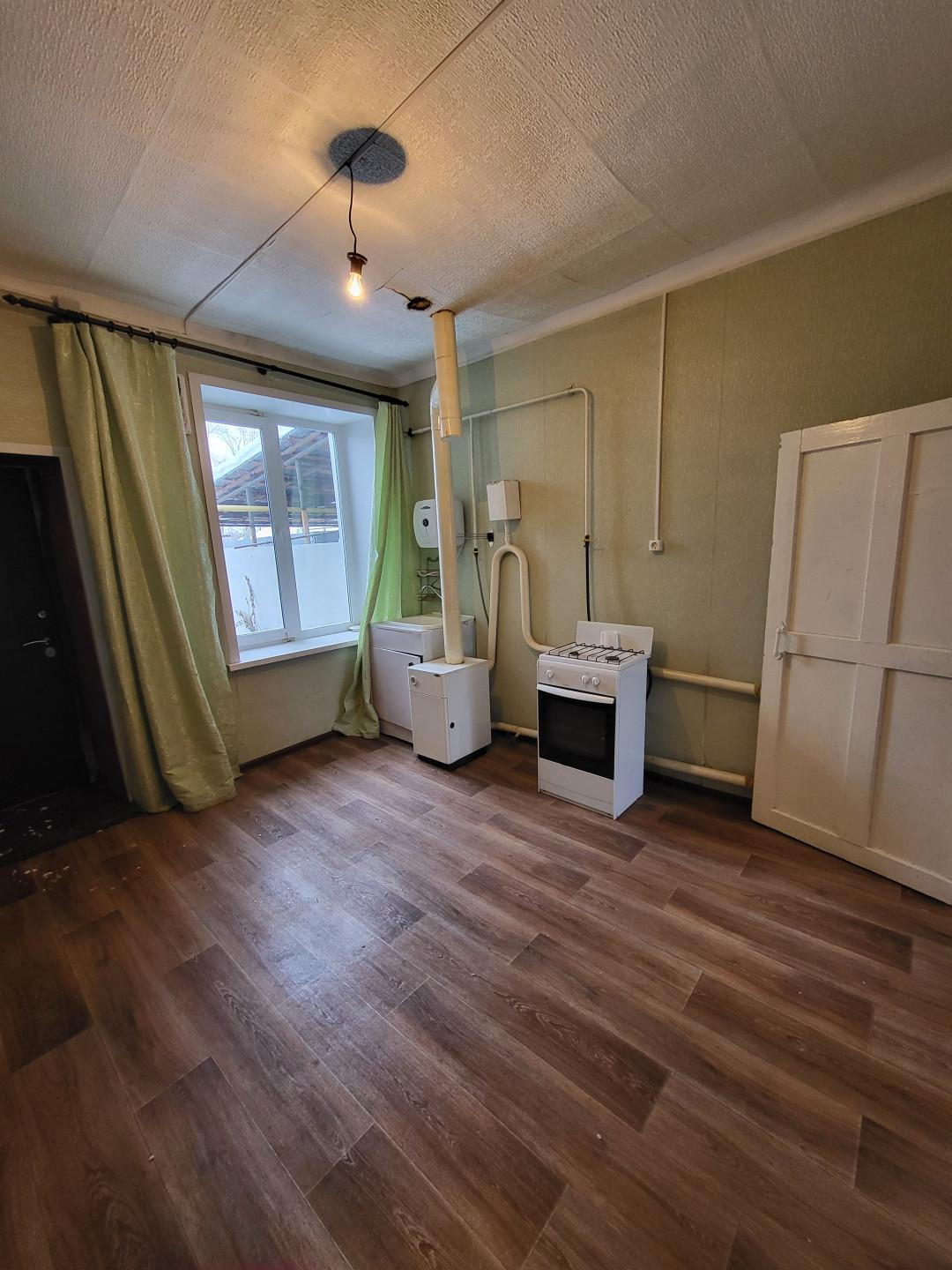 Общая площадь квартиры 24.3 кв. м, квартира неугловая находится в середине дома. Жилая комната 14кв.м, просторная кухня, в которой можно организовать санузел (канализационные трубы проложены).