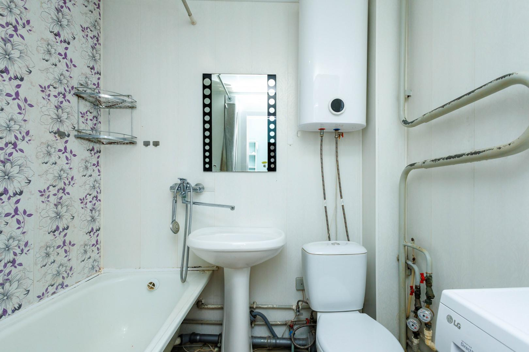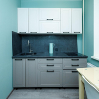 Включает кухонный гарнитур с вытяжной системой, варочной панелью и холодильником, а также диван, шкаф, бойлер, стиральную машину и тумбу под телевизор.