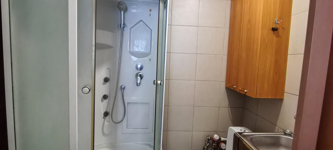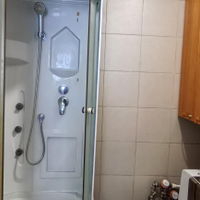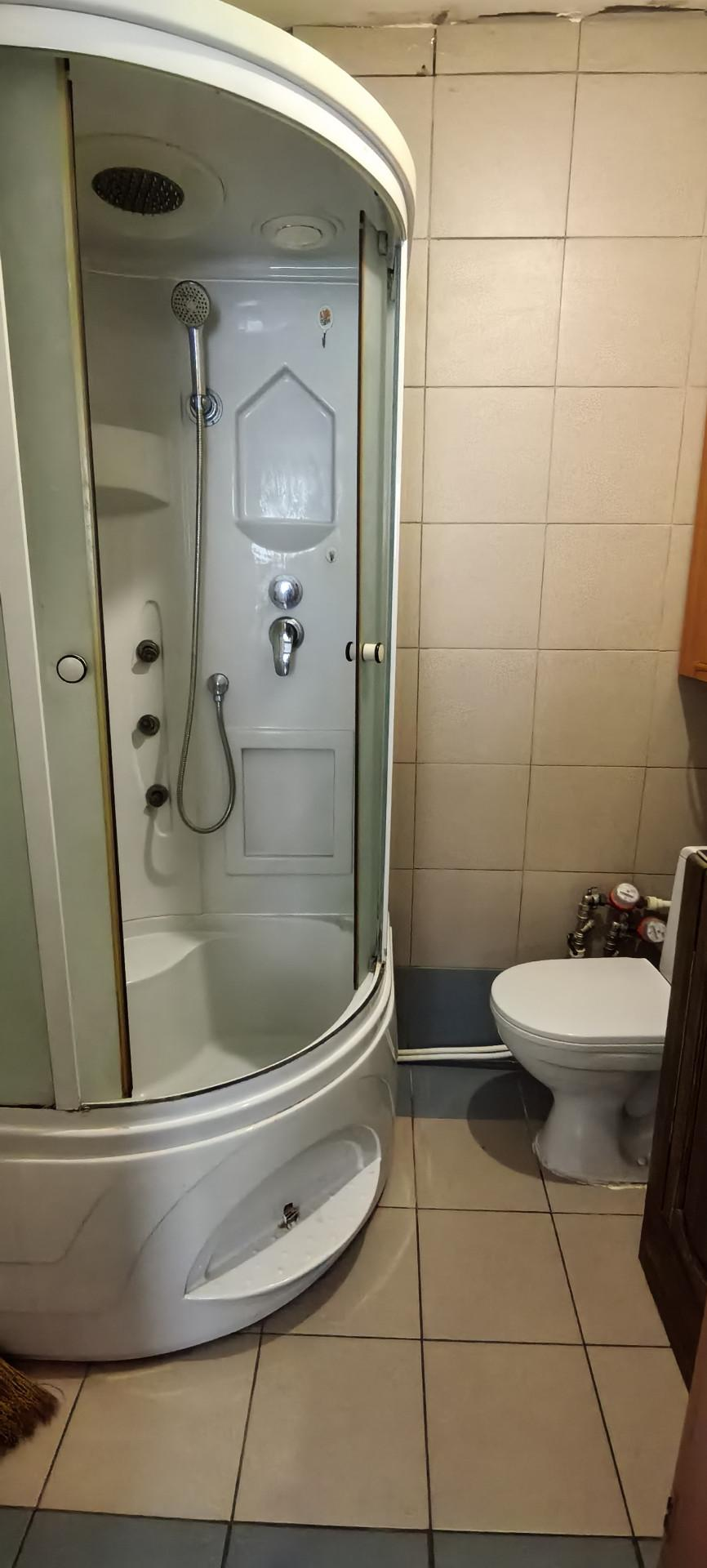Помимо кухни-гостиной есть ещё и просторная комната. В ней расположен шкаф, диван. В совмещенной санузле выложена плитка и установлена душевая кабина