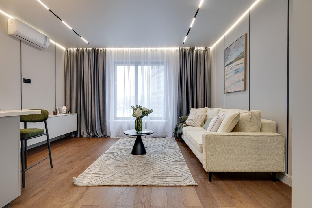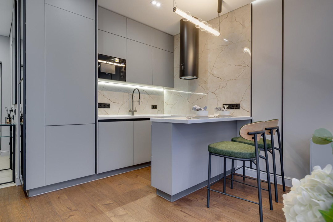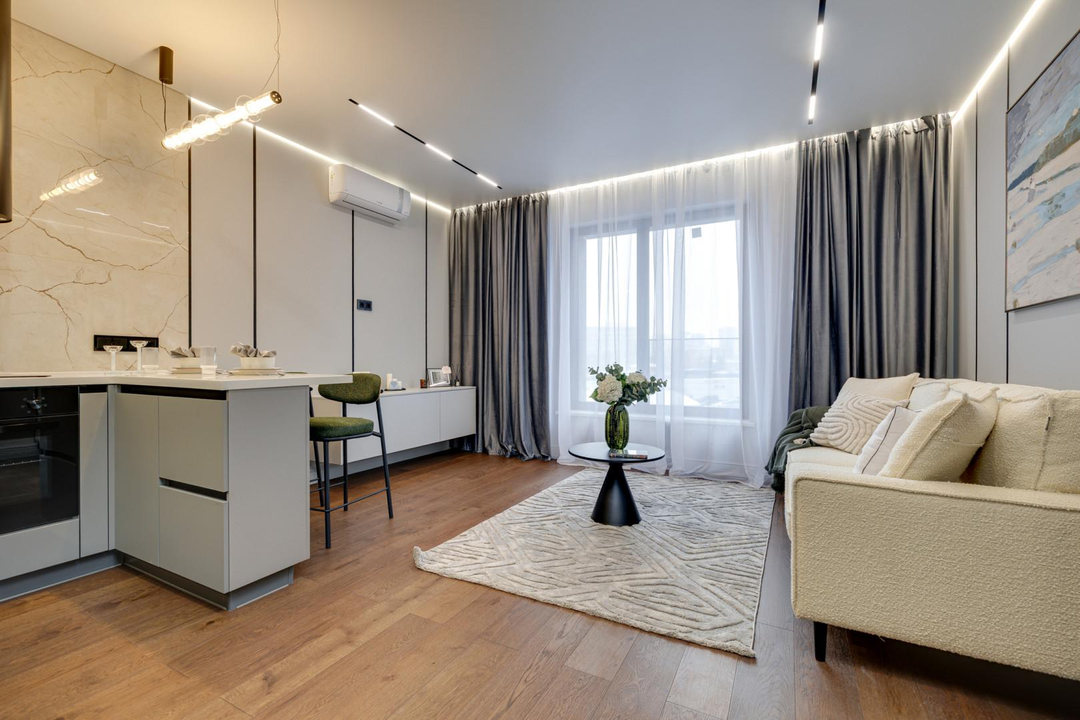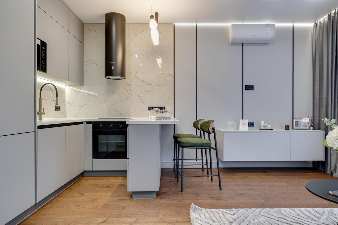 - Эстетичный современный ремонт в спокойной серой палитре, продуманное зонирование.