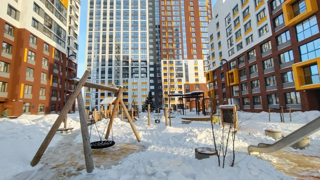 Тихий закрытый двор с современными детскими площадками и спортивными тренажерами.