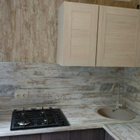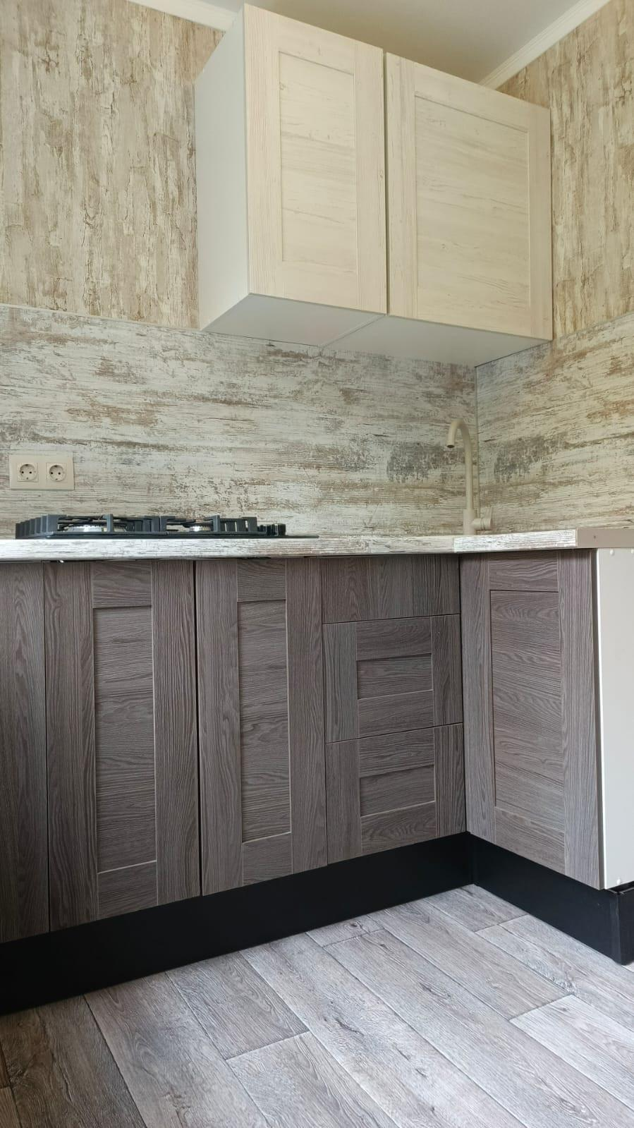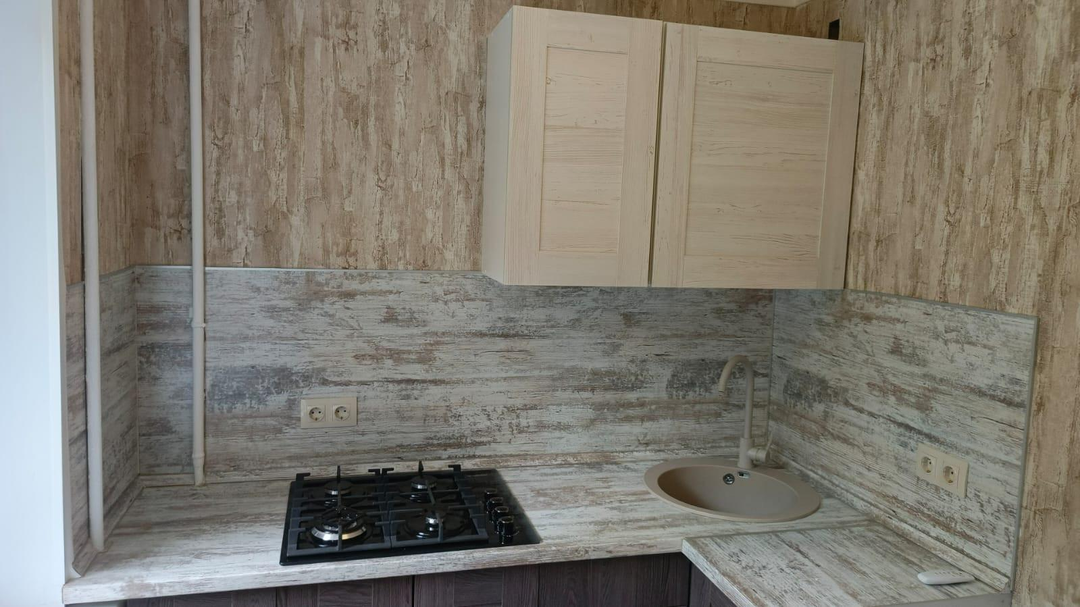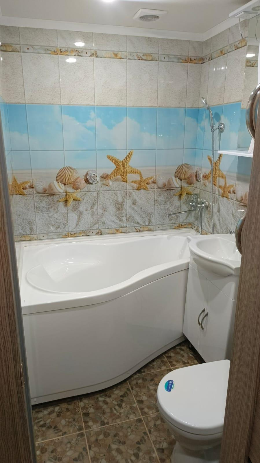 Заменена сантехника, установлены кухонный гарнитур и встроенная варочная панель, в ванной комнате установлены новые унитаз, ванная, раковина.