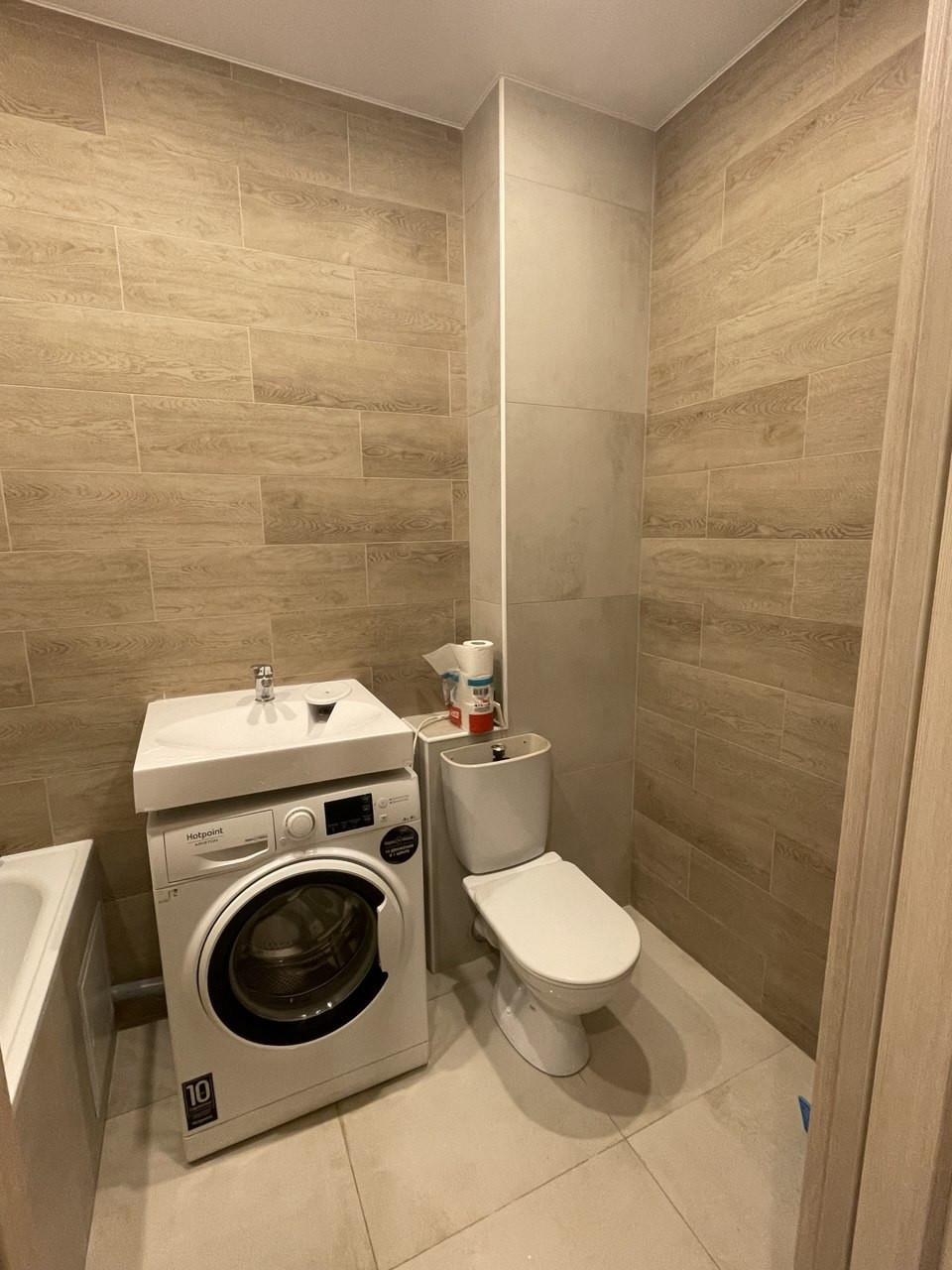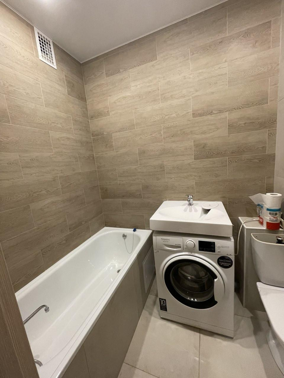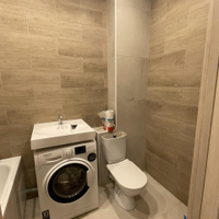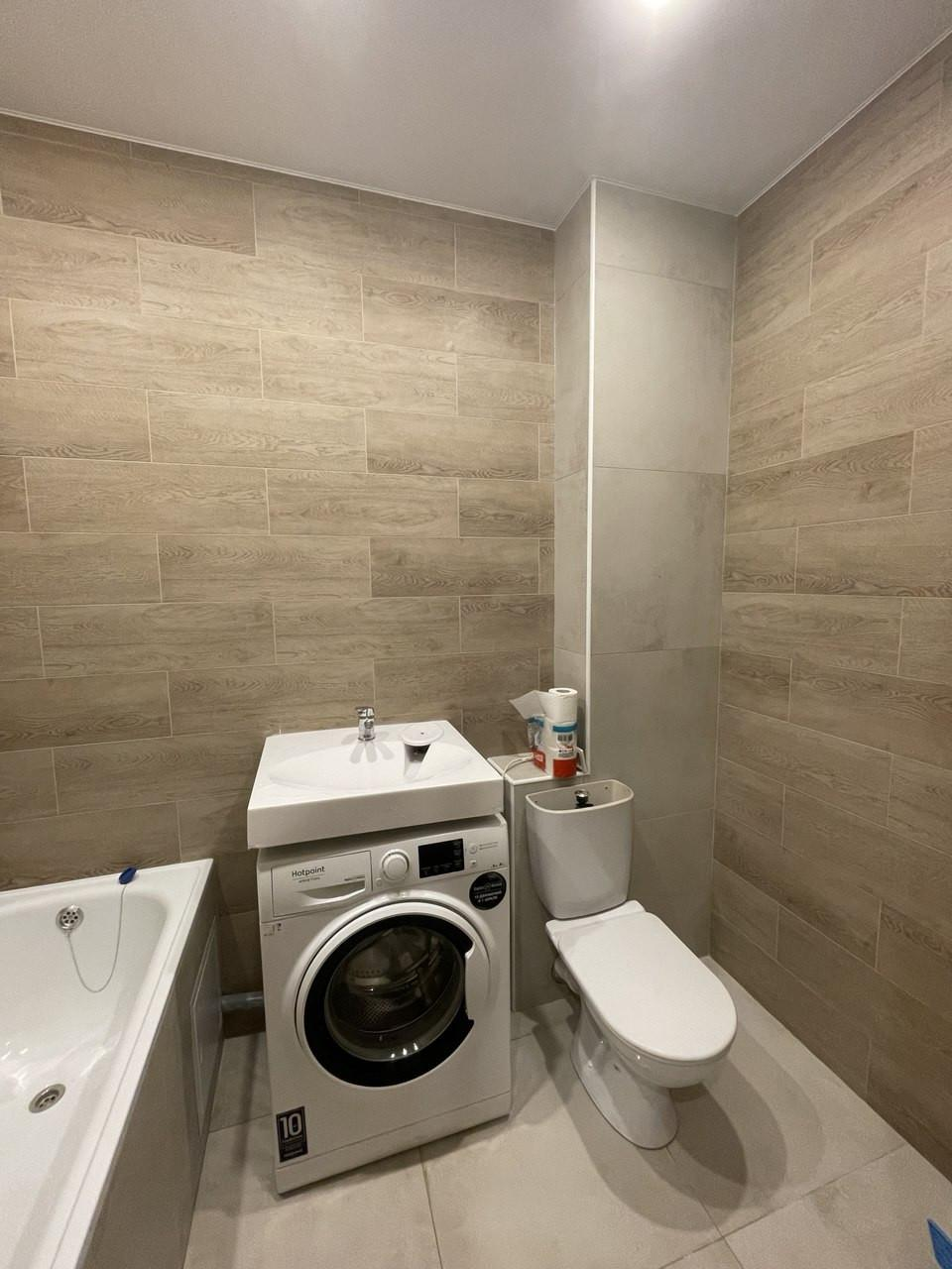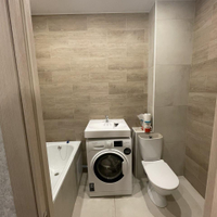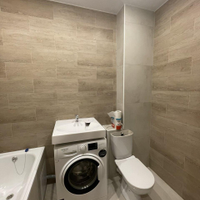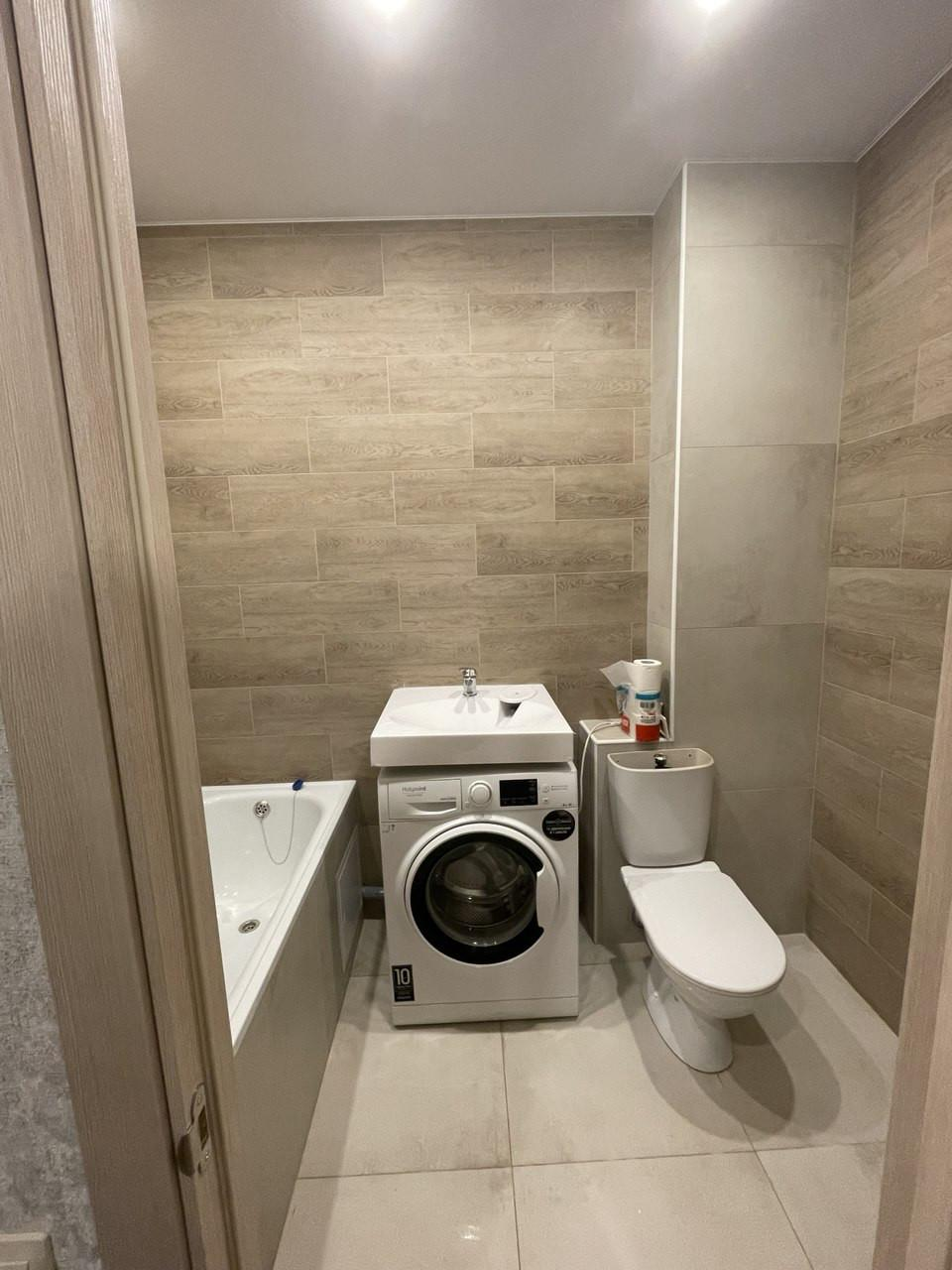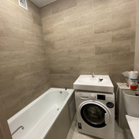 Просторный современный совмещенный санузел вмещает в себя большую ванну,стиральную машину. Плитка до потолка.