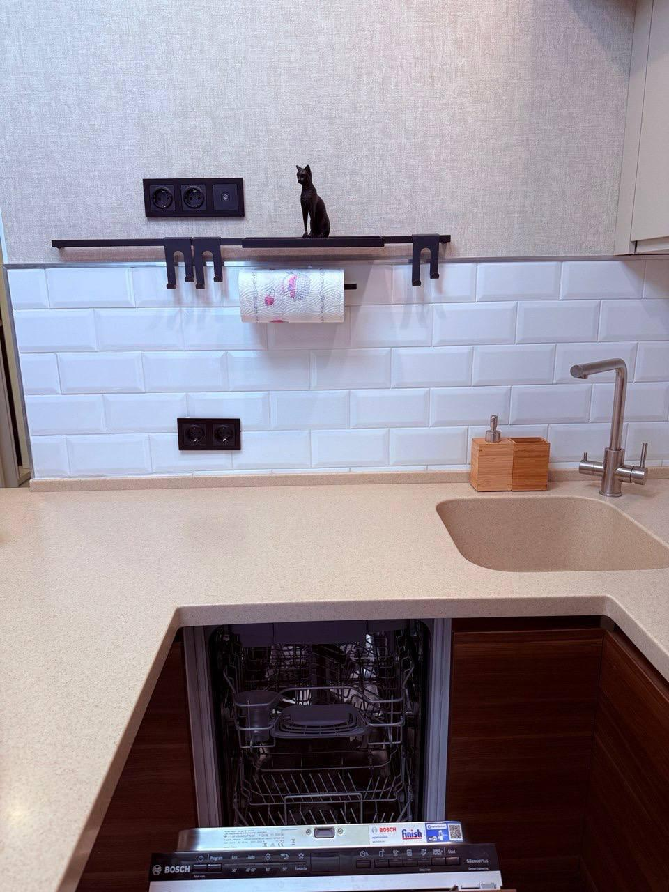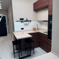 · Качественная встроенная кухня с монолитной столешницей – стильно, надежно, практично. Продумана до мелочей.
