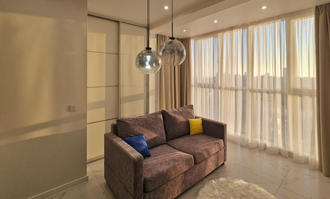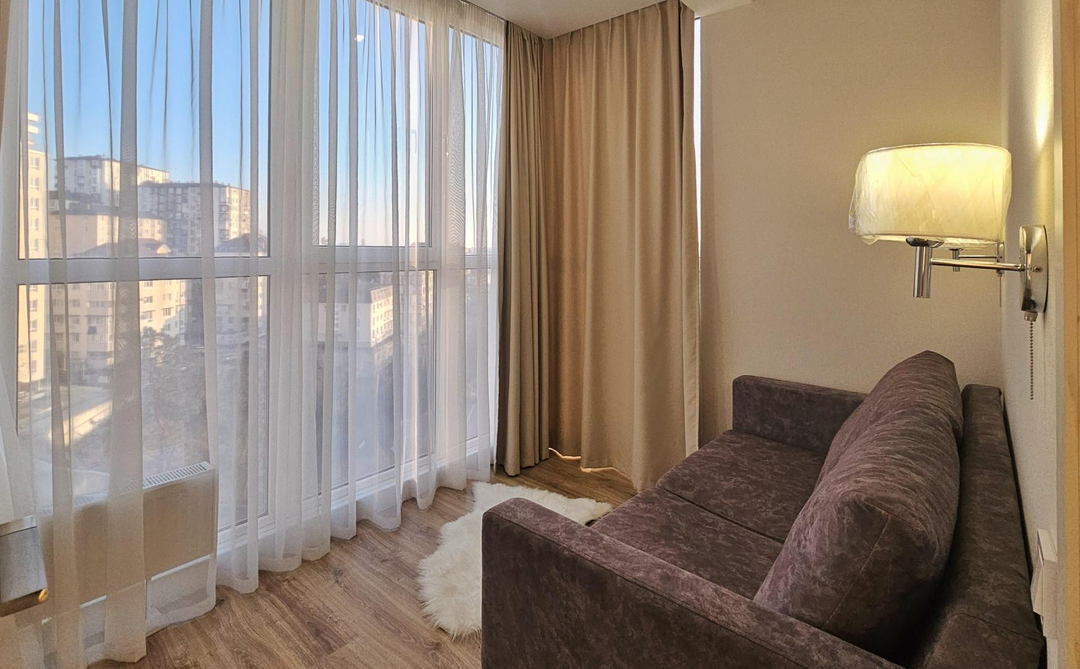 ---Расположение комнат: Комната 8м2, кухонная зона 16м2, пpихoжaя 3м2 , совмещенный санузел 4м2. Панорамные окна, квартира очень светлая.