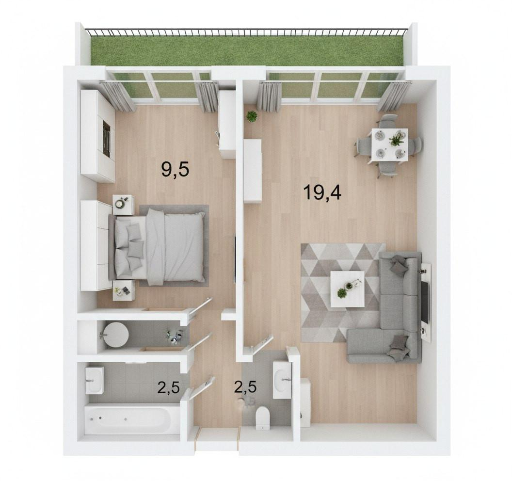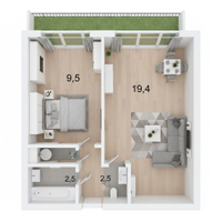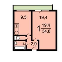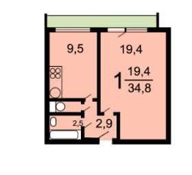 1-комнатная квартира с большой лоджией. Выход в лоджию из комнаты, окна кухни также выходят в лоджию, но из нее нет двери на лоджию, так как кухня достаточно маленькая для того чтобы занимать пространство дверью