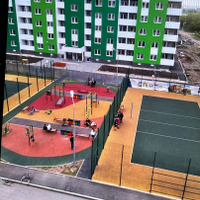 Комплекс имеет разнообразные детские и спортивные площадки, дорожки для бега и велосипедных прогулок.