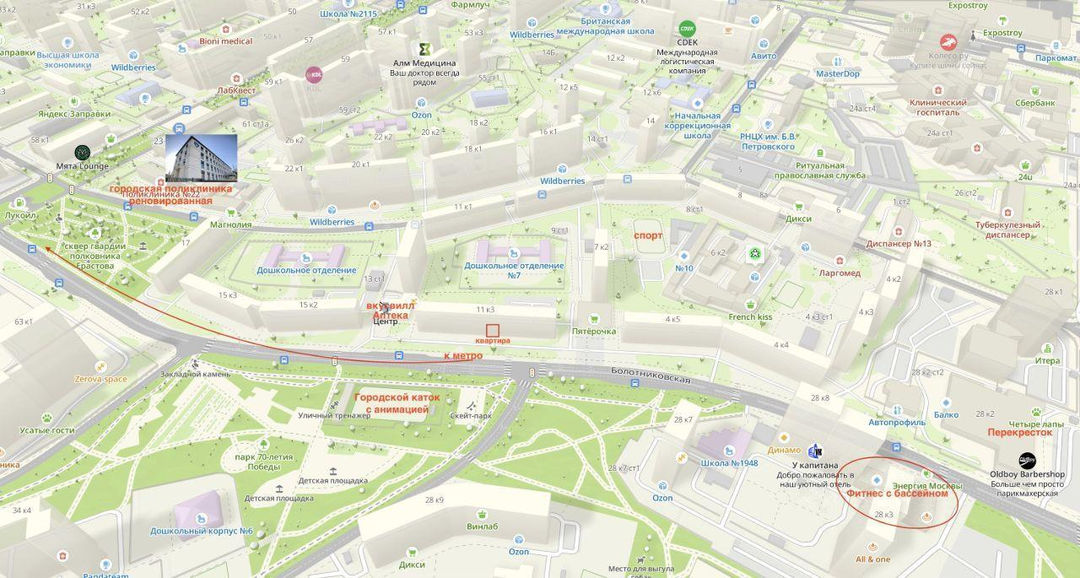 Здоровье: Реновированная взрослая поликлиника, ветеринарная клиника и детские бассейны в соседнем доме.