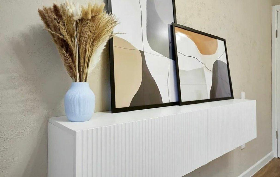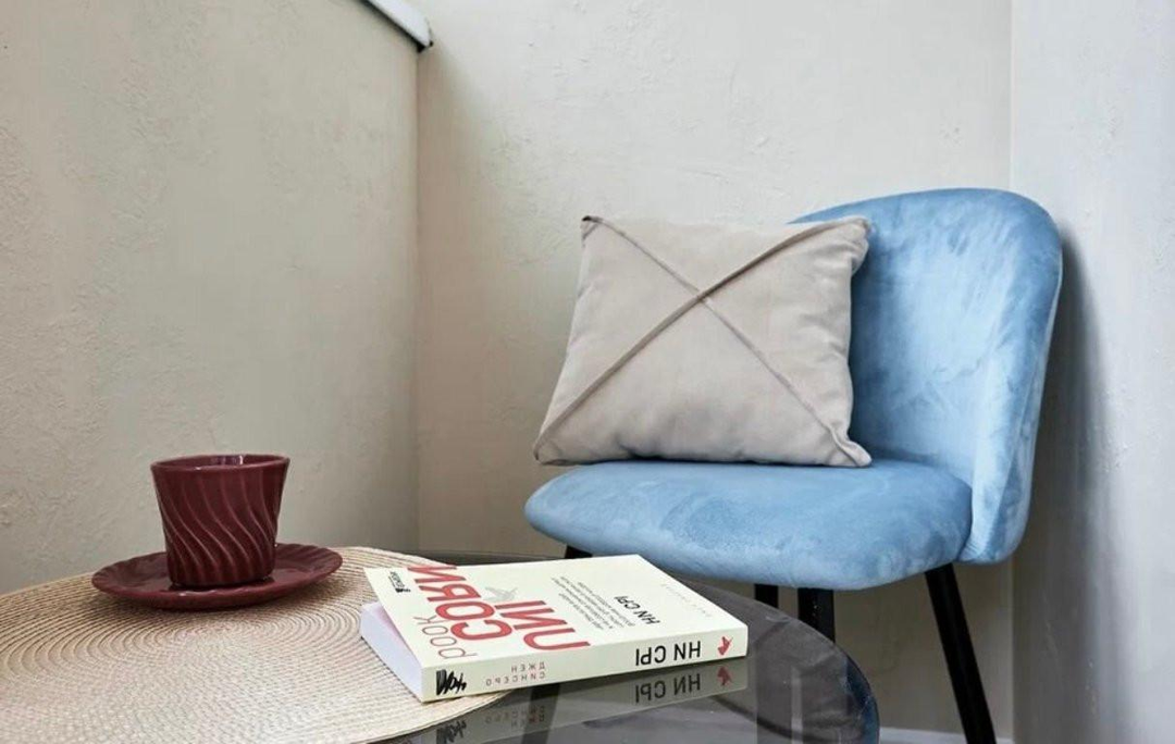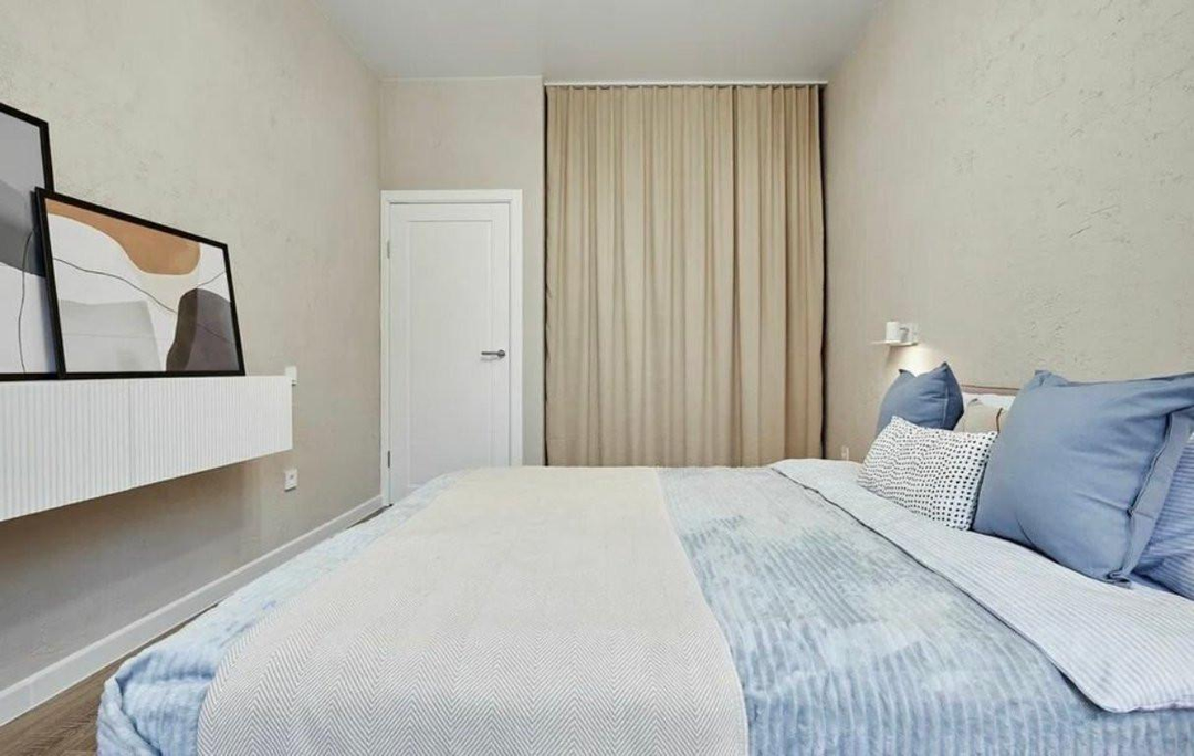 Современное дизайнерское решение выполнено в светлых тонах, со умиротворяющими голубыми акцентами. Это уютная квартира для комфортной жизни, созданная с любовью и вниманием к деталям.