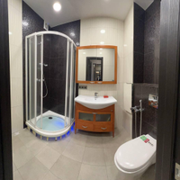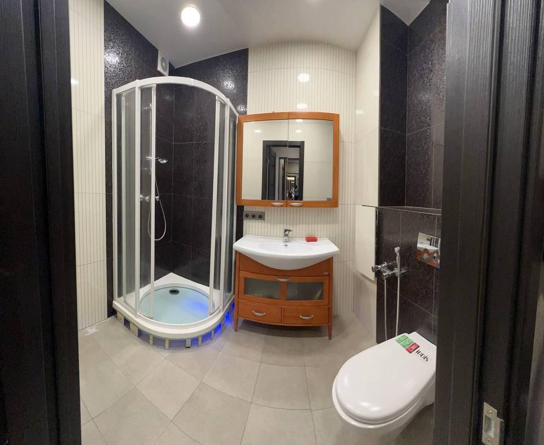Санузел: полностью облицован итальянской плиткой; сантехника и мебель из натурального дерева в ванной комнате (Италия); итальянские смесители; душевая кабина из стекла, также Италия.