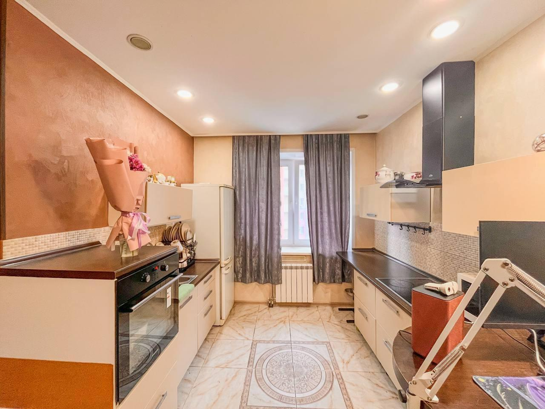 В рабочей зоне кухни, коридоре, санузлах уложена качественная из керамогранита плитка с теплыми полами.