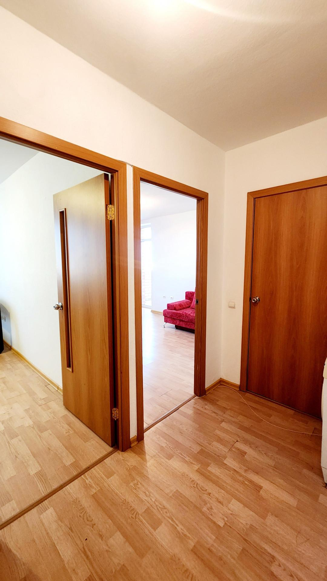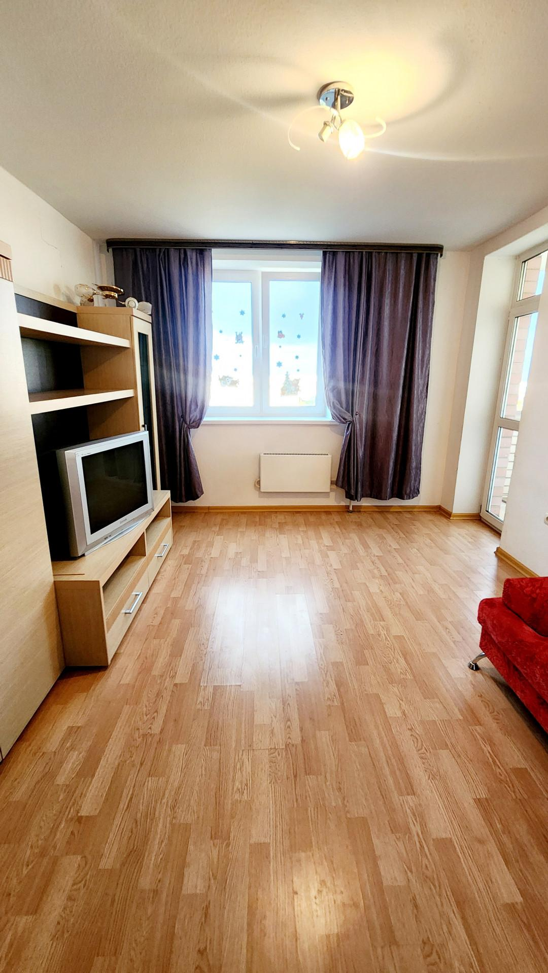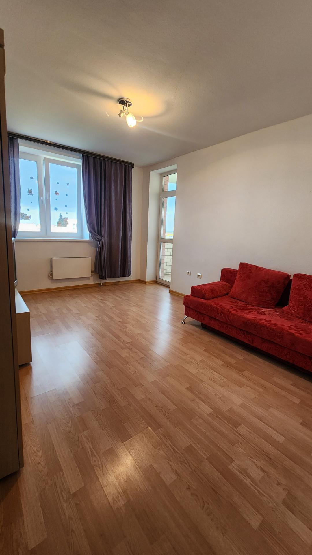 Не угловая, общей площадью 35,4 кв.м, комната 15,5 кв.м, кухня 11.3 кв.м., просторный коридор. Ремонт от застройщика, стены и потолок под покраску, ламинат. Сан. узел совмещен, на полу кафель. Квартира ОЧЕНЬ светлая, открывается прекрасный вид на город. Лоджия 5 кв.м.