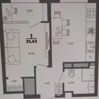 Квартира общей площадью 35,6 кв. м.(кухня 12 кв. м + лоджия 3,5, комната 10 кв. м с гардеробной и панорамным остеклением, санузел 4 кв. м, коридор 4,6 кв.м).