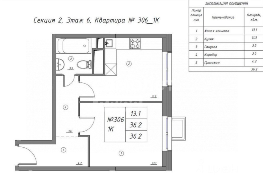 Площадь — 36,2 м²