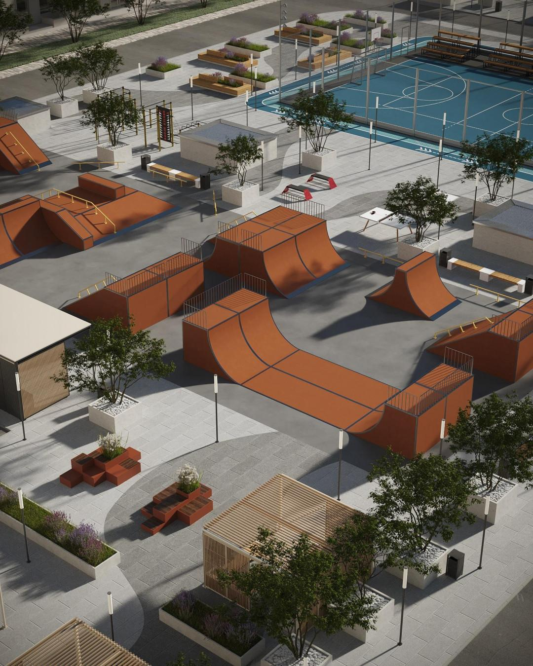 Современные спортивные площадки и скейт-парк