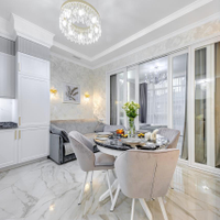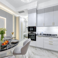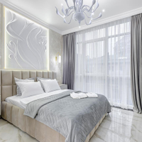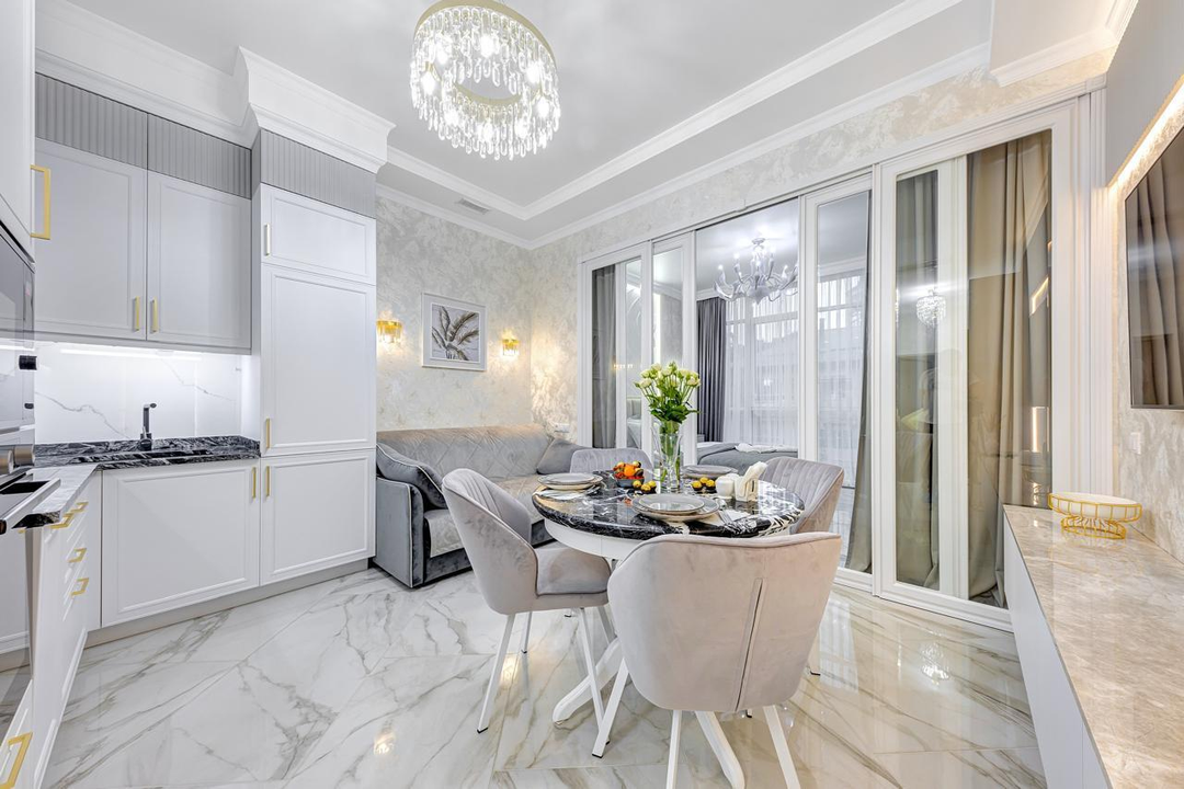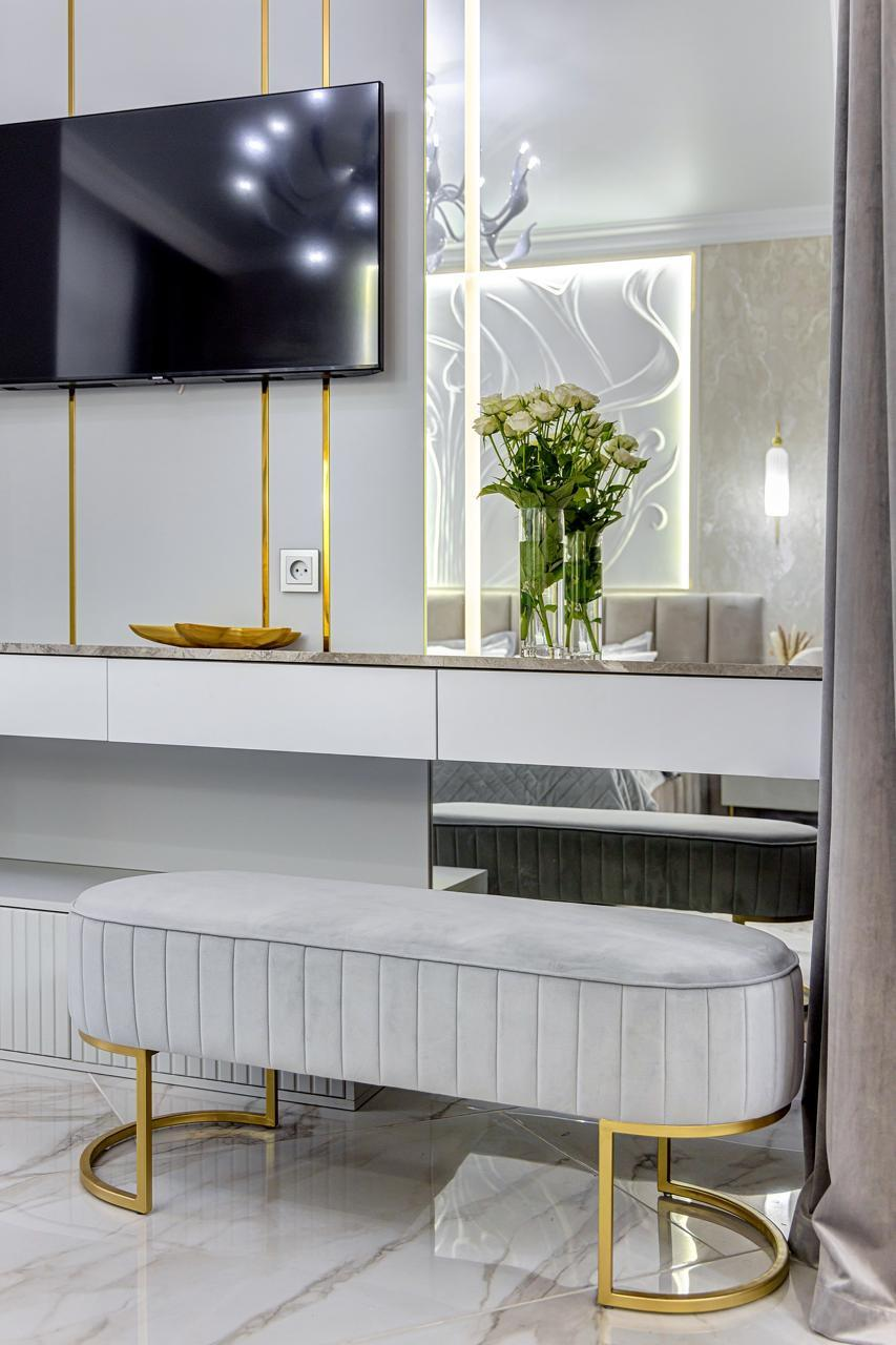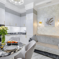 Мебель изготовлена по индивидуальному заказу так, что каждый сантиметр в квартире использован максимально эффективно. Мебельные фасады от производителя "Томские мебельные фасады", столешницы консолей в спальне и гостиной изготовлены из натурального камня. Над кроватью эксклюзивное гипсовое панно ручной работы. В зоне гостиной стол со столешницей из натурального итальянского мрамора. Столешница и фартук кухонной зоны сделаны из премиального натурального гранита из Индии.
