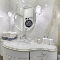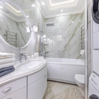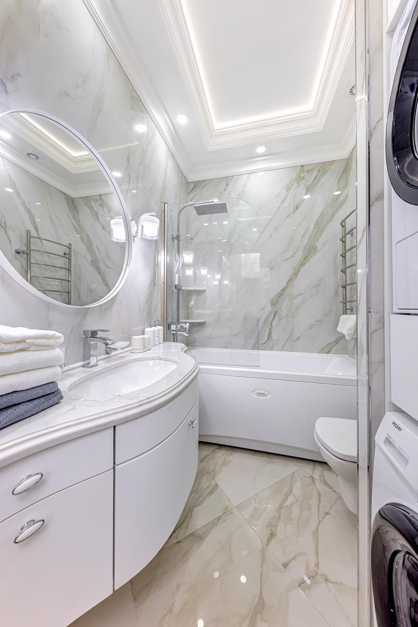 В ванной стены отделаны цельным широкоформатный керамогранитом, размер плит - 2,4м на 1,2м. Столешница для раковины выполнена из агломерата кварца. Сама раковина от производителя Villeroy & Boch. Уголки из нержавеющей стали. Установлены стиральная и сушильная машины.