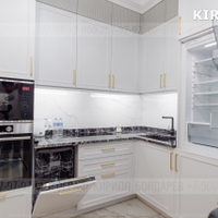 Кухня укомплектована техникой - духовой шкаф, вытяжка, микроволновая печь, посудомоечная машина, встроенный холодильник. Смеситель японского производителя OMOIKIRI. Каменная мойка.