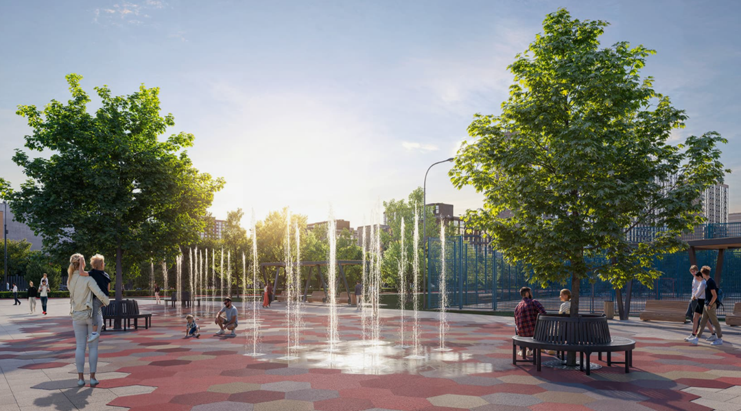 В рамках благоустройства создан парк площадью 20 га. Он объединяет зоны отдыха, спорта и развлечений: от игровых площадок и велодорожек до амфитеатра и колеса обозрения. Предусмотрены места для пикников, скейт‑парк, безопасный игровой комплекс для детей. Дворы оснащены спортивными и детскими площадками.