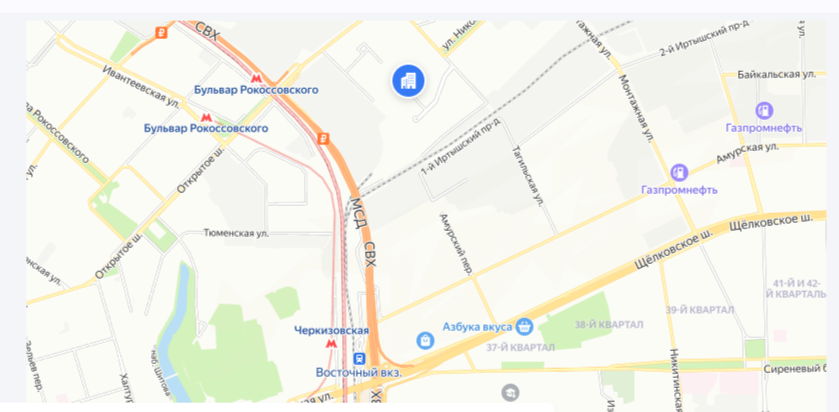 • метро «Бульвар Рокоссовского» - 15 минут пешком