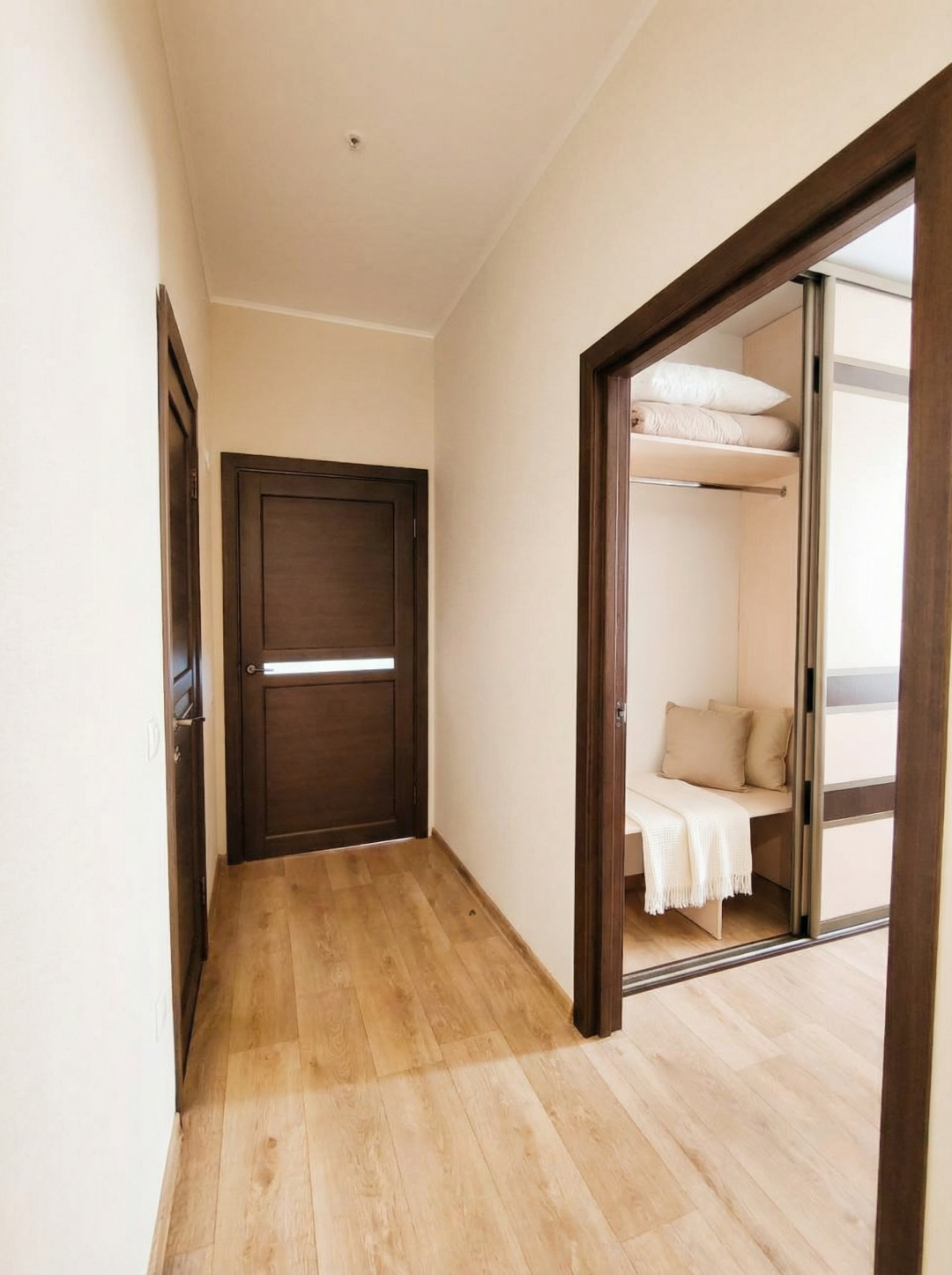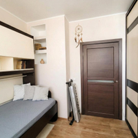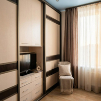 В комнате установлен вместительный шкаф-купе с выдвижными ящиками и встроенной мебелью.