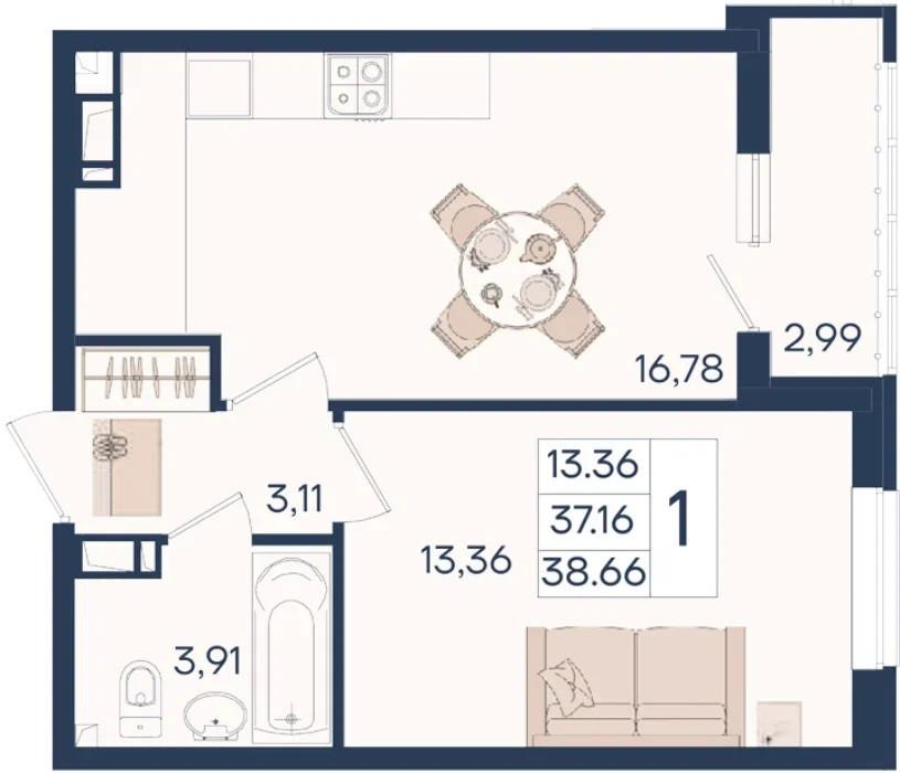 1-к. квартира, 38,7 м²