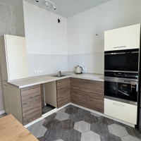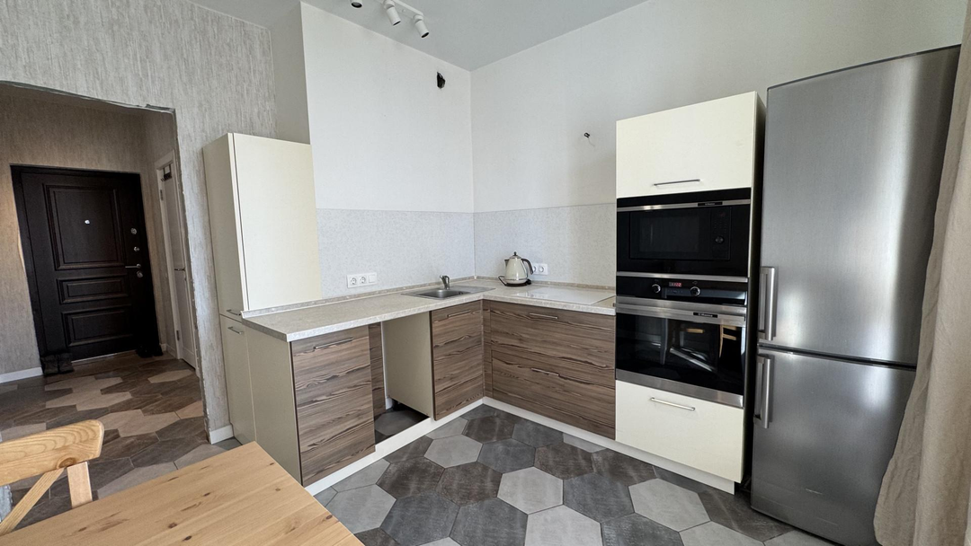 Кухня: готовый кухонный гарнитур, встроенные плита, духовой шкаф, микроволновая печь. Предусмотрено место под посудомоечную машинку.
