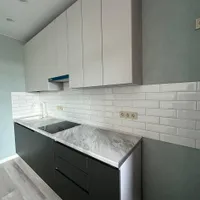 Кухонный гарнитур укомплектован необходимой бытовой техникой. Стоят счетчики воды.