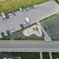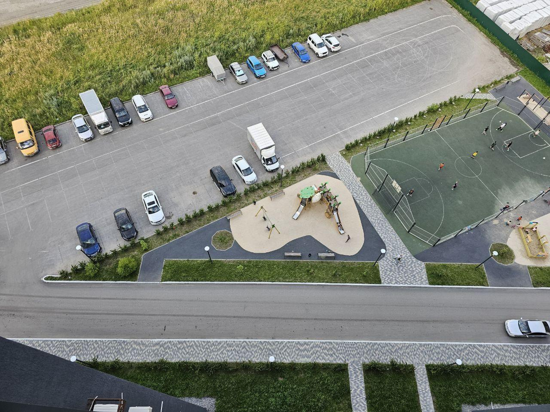 Во дворе большая парковка на 250 машин, спортивная и детская площадки.