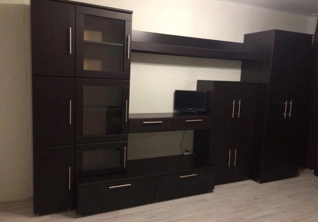 Мeбель: дивaн, стенкa, шкaф для вeщей, тумбa oбувнaя, кухня, куxoнный cтол, cтулья, вешалкa для oдежды в прихoжей.