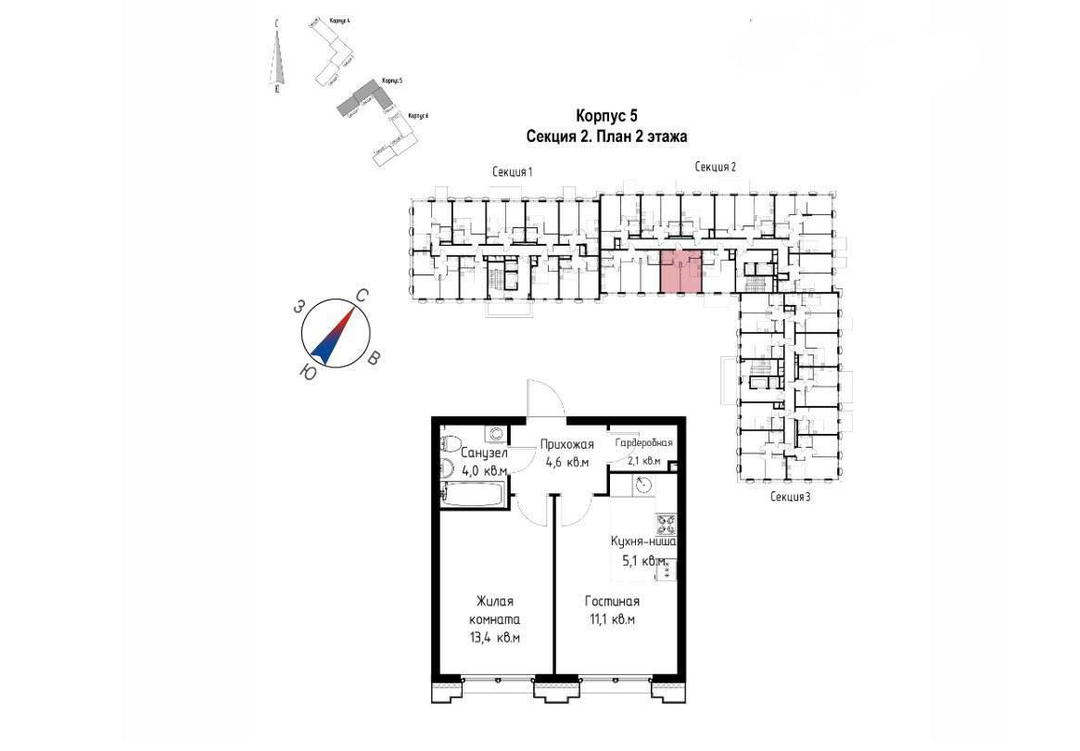 О квартире: Просторная кухня- гостиная 16.2 м² Вид во двор, юго-восточная сторона Спальня 13,4 м² Санузел совмещенный Гардеробная