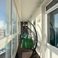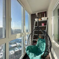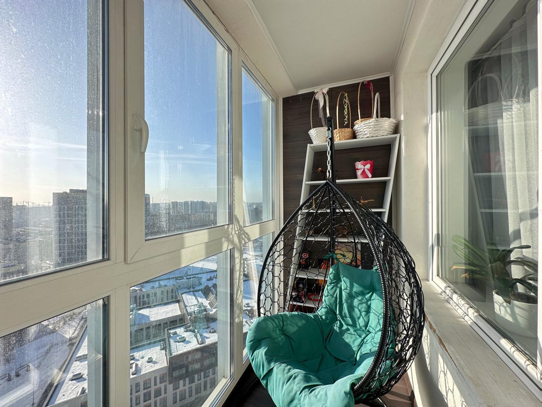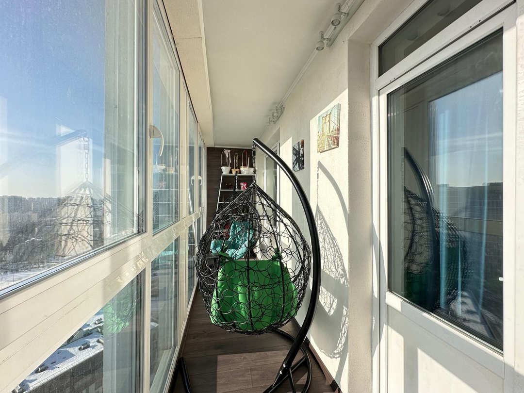 Выход на просторную остекленную лоджию, которая превращена в уютную лаунж-зону. Здесь, с чашкой утреннего кофе или бокалом вечернего вина, вас ждут два кресла-качели. Это ваше личное пространство для медитации с панорамным видом на город.