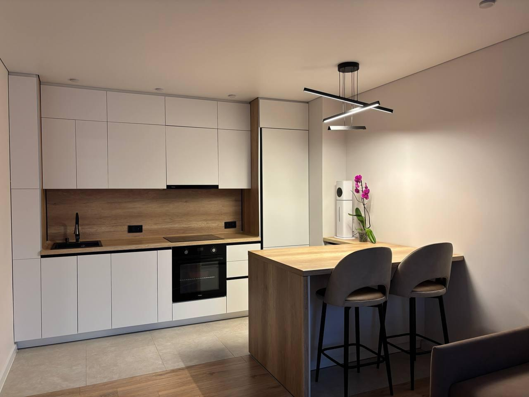 Дизайнерская кухня со встроенной техникой и стильной барной зоной