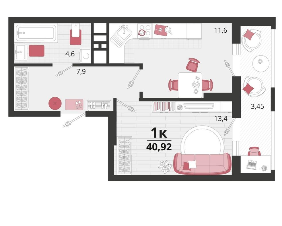 1-к. квартира, 40,9 м²