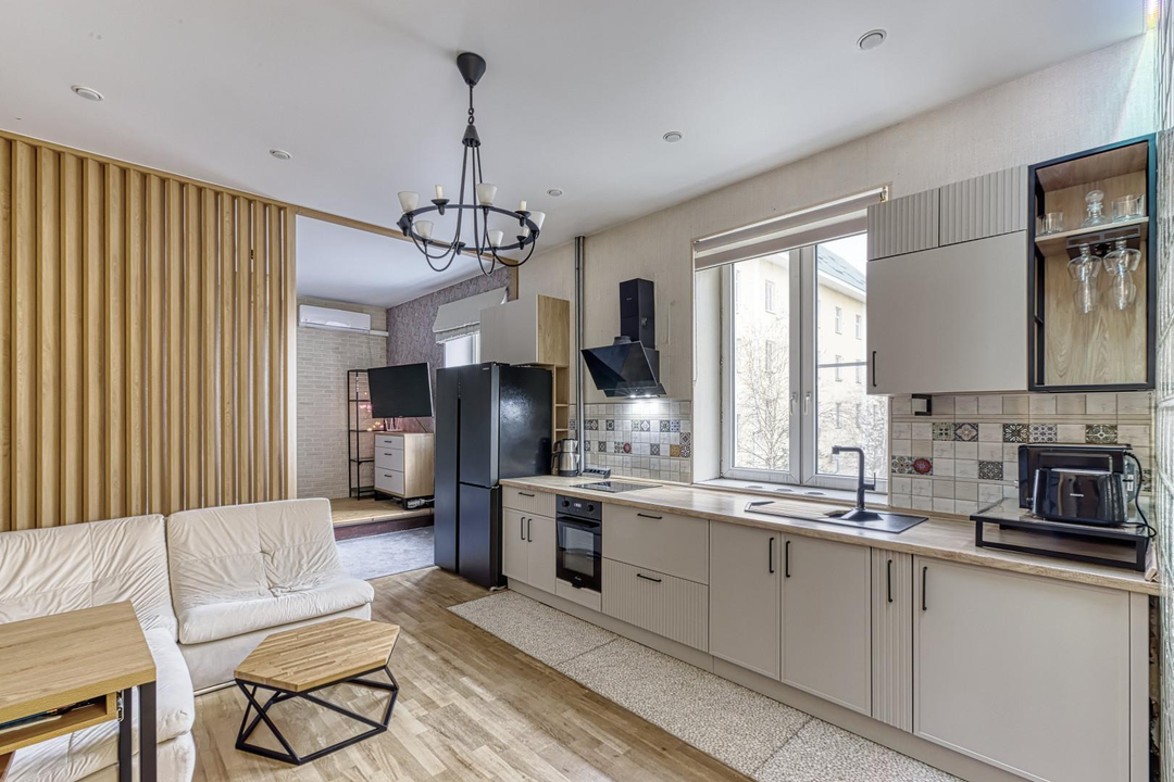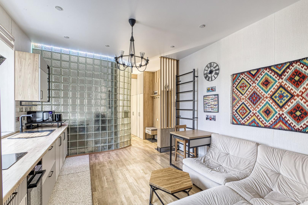 Вся мебель, которая идеально вписана в пространство, изготовлена на заказ и остаётся новому владельцу. Это решение для тех, кто ищет уникальное жильё с характером, не требующее дополнительных вложений.