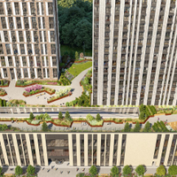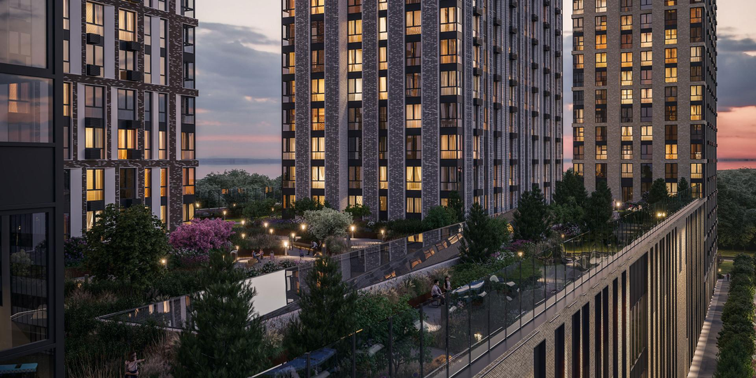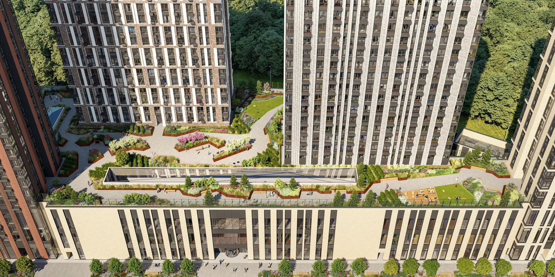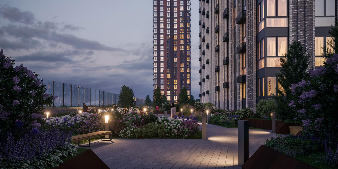 Закрытый двор-парк, который расположился на крыше стилобата. На высоте шестого этажа организовано обширное пространство для досуга, отдыха и занятий спортом.