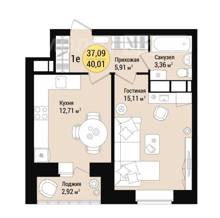 Квартира с просторной кухней 12,7 кв.м. с выходом на лоджию, где можно создать уютный уголок для отдыха.