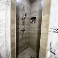 -Душевая зона ,подвесной унитаз,грамотное освещение.