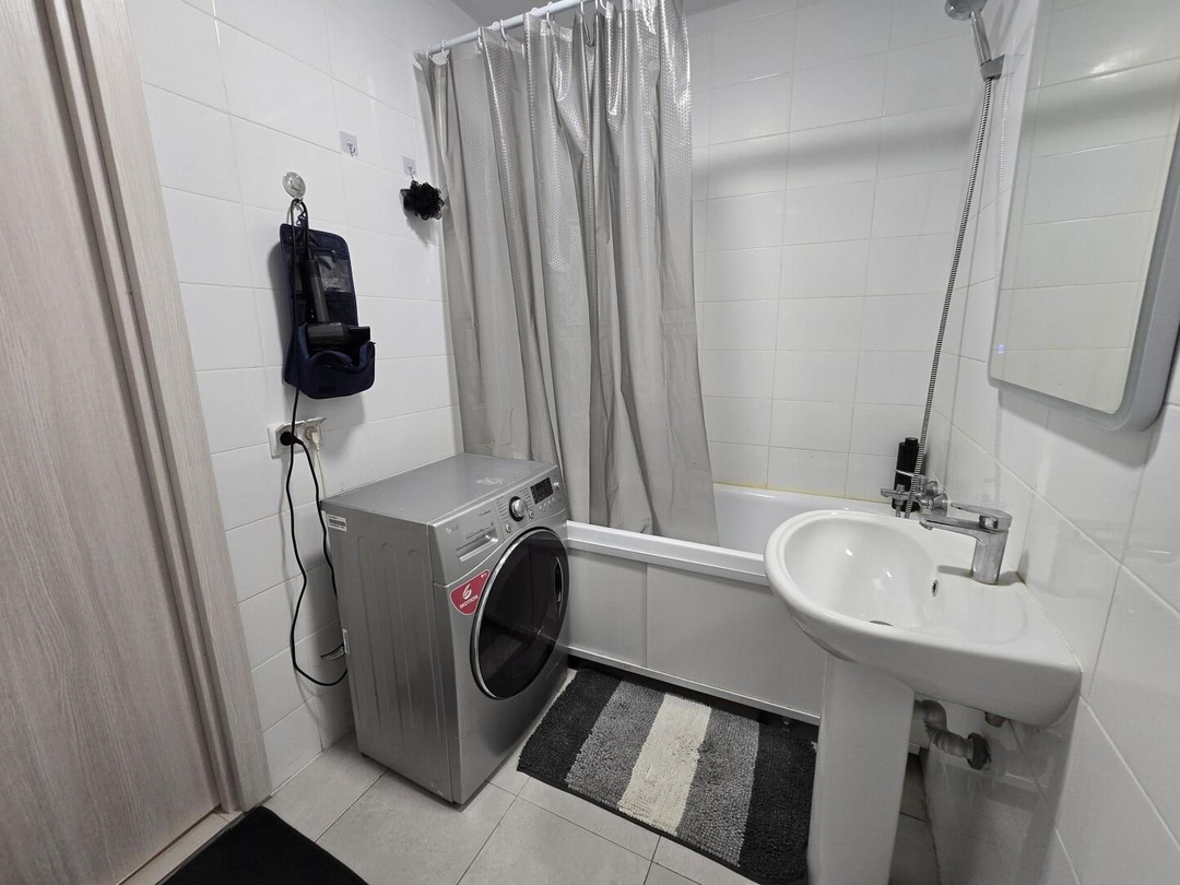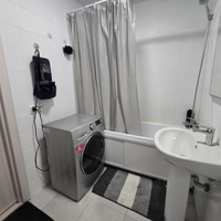 Просторная ванная комната . Стиральная машина LG.
