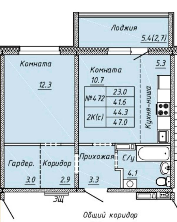 Площадь квартиры без учета лоджии - 41,6 кв.м расположена на 5 этаже 10 этажного дома.